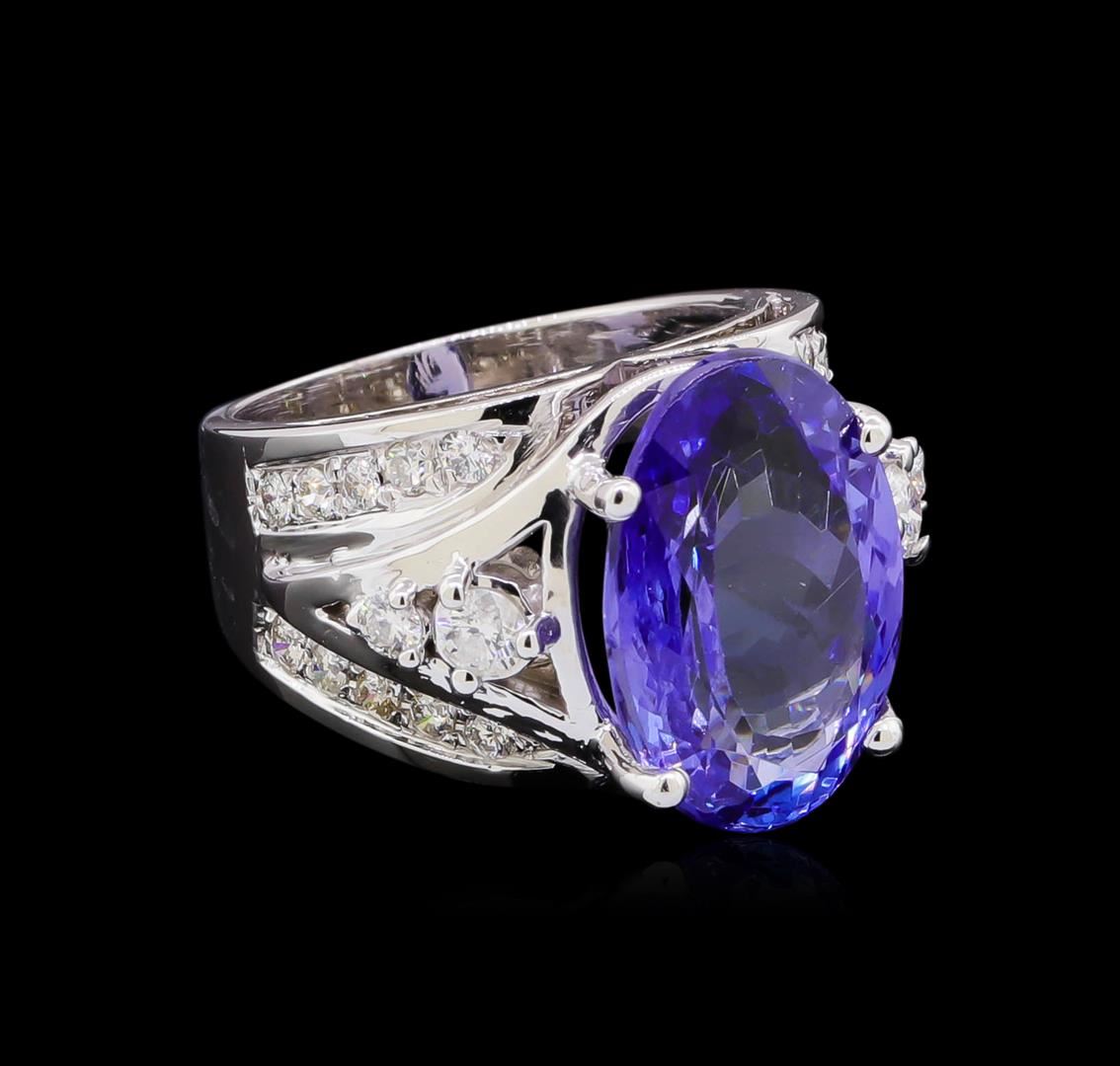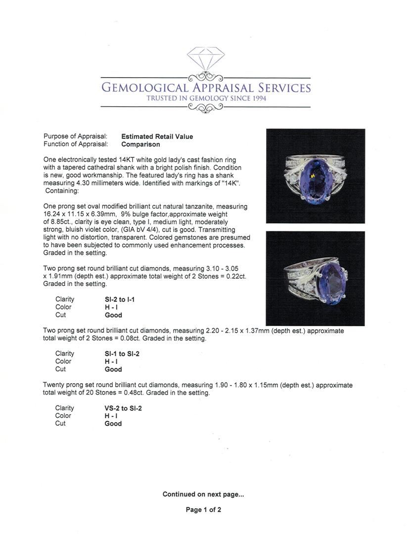One electronically tested 14KT white gold lady's cast fashion ring with a tapered cathedral shank with a bright polish finish. The featured lady's ring has a shank measuring 4.30 millimeters wide. Identified with markings of "14K". Condition is new, good workmanship. Containing: One prong set oval modified brilliant cut natural tanzanite, measuring 16.24 x 11.15 x 6.39mm, 9%. bulge factor, approximate weight of 8.85ct., clarity is eye clean, type I, medium light, moderately strong, bluish violet color, (GIA bV 4/4), cut is good. Transmitting light with no distortion, transparent. Colored gemstones are presumed to have been subjected to commonly used enhancement processes. Graded in the setting. Two prong set round brilliant cut diamonds, measuring 3.10 - 3.05 x 1.91mm (depth est.) approximate total weight of 2 Stones = 0.22ct. Graded in the setting. Clarity: SI-2 to I-1. Color: H - I. Cut Good Two prong set round brilliant cut diamonds, measuring 2.20 - 2.15 x 1.37mm (depth est.) approximate total weight of 2 Stones = 0.08ct. Graded in the setting. Clarity: SI-1 to SI-2. Color: H - I. Cut Good Twenty prong set round brilliant cut diamonds, measuring 1.90 - 1.80 x 1.15mm (depth est.) approximate total weight of 20 Stones = 0.48ct. Graded in the setting. Clarity: VS-2 to SI-2. Color: H - I. Cut Good. Total Weight of Colored Stones 8.85ct. Total Weight of Diamonds 0.78ct. Total Weight of Ring 10.60gm. GAS Appraised at $12,700.00.
