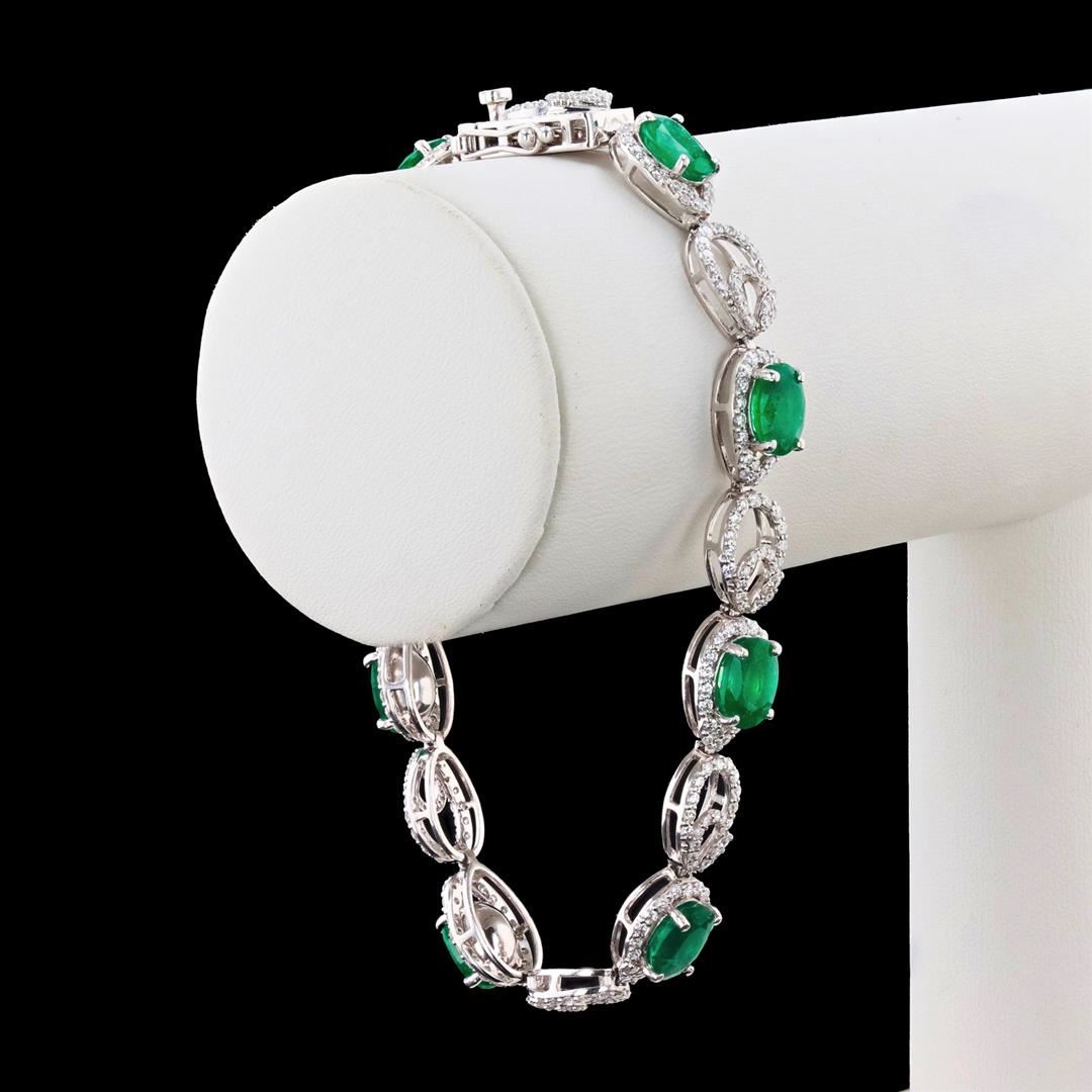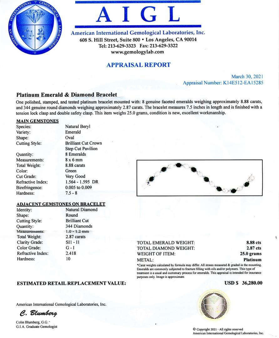 8.88ctw Emerald and 2.87ctw Diamond Platinum Bracelet. Please see Photos and Description for all available information. This 8.88ctw Emerald and 2.87ctw Diamond Platinum Bracelet is a stylish and timeless piece of jewelry. The bracelet features 8 genuine emeralds,344 genuine round diamonds,7.5 inch platinum bracelet.