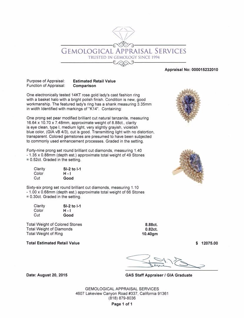 One electronically tested 14KT rose gold lady's cast fashion ring with a basket halo with a bright polish finish. The featured lady's ring has a shank measuring 3.35mm in width Identified with markings of "K14". Condition is new, good workmanship. Containing: One prong set pear modified brilliant cut natural tanzanite, measuring 16.64 x 10.70 x 7.48mm, approximate weight of 8.88ct., clarity is eye clean, type I, medium light, very slightly grayish, violetish blue color, (GIA vB 4/3), cut is good. Transmitting light with no distortion, transparent. Colored gemstones are presumed to have been subjected to commonly used enhancement processes. Graded in the setting. Forty-Nine prong set round brilliant cut diamonds, measuring 1.40 - 1.35 x 0.88mm (depth est.) approximate total weight of 49 Stones = 0.52ct. Graded in the setting. Clarity: SI-2 to I-1. Color: H - I. Cut Good Sixty-Six prong set round brilliant cut diamonds, measuring 1.10 - 1.00 x 0.68mm (depth est.) approximate total weight of 66 Stones = 0.30ct. Graded in the setting. Clarity: SI-2 to I-1. Color: H - I. Cut Good. Total Weight of Colored Stones 8.88ct. Total Weight of Diamonds 0.82ct. Total Weight of Ring 10.40gm. GAS Appraised at $12,075.00.