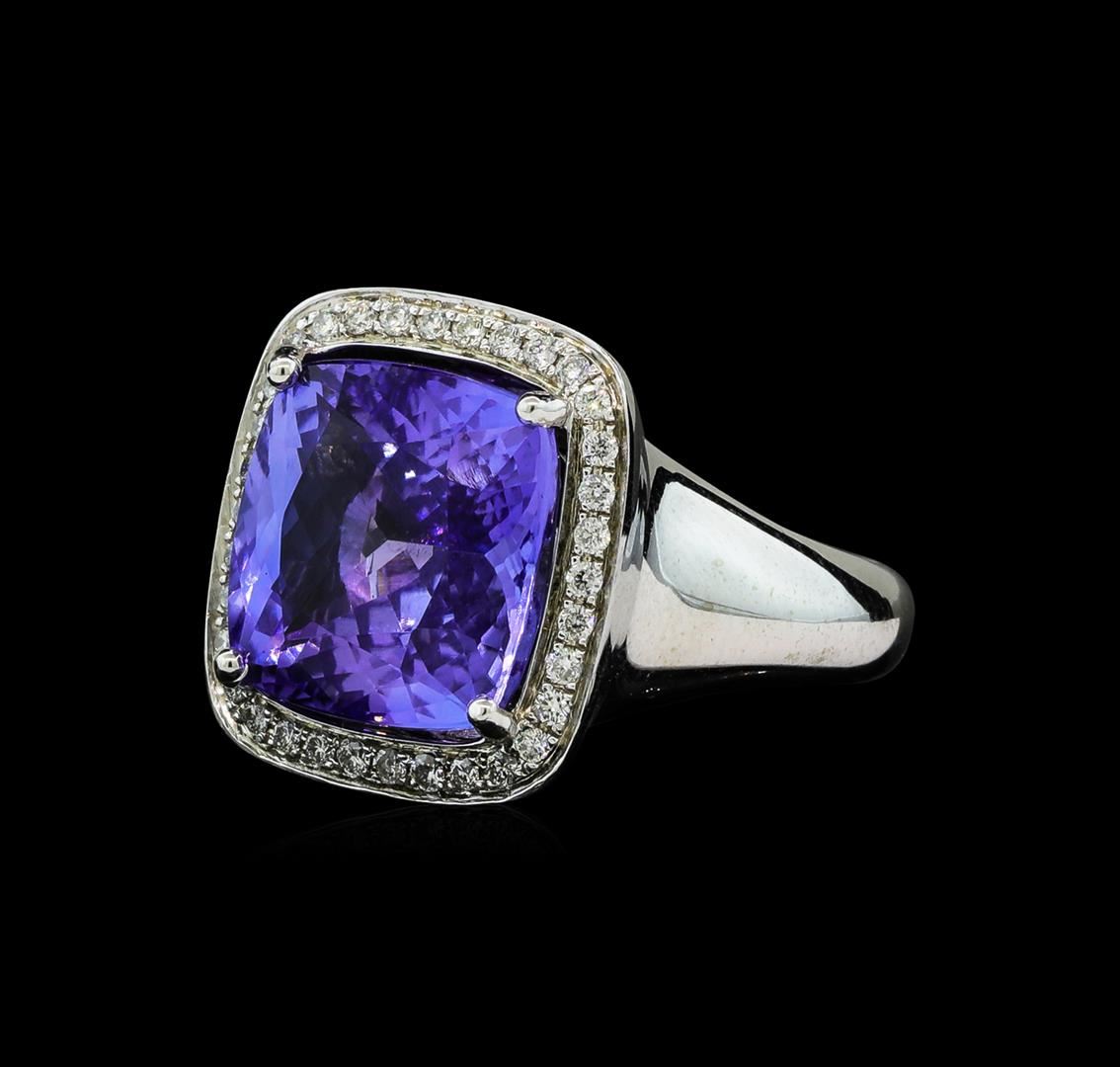 One electronically tested 14KT white gold lady's combination cast & assembled fashion ring with a tapered shank with a bright polish finish. The featured lady's ring has a shank measuring 4.23 millimeters wide. Identified with markings of '14K'. Condition is new, good workmanship. Containing: One prong set square cushion modified brilliant cut natural tanzanite, measuring 12.05 x 12.00 x 6.99mm, (depth est.) 12%. bulge factor, approximate weight of 8.90ct., clarity is eye clean, medium light, moderately strong, violet color, (GIA V 4/4), cut is very good. Transmitting light with no distortion, transparent. Colored gemstones are presumed to have been subjected to commonly used enhancement processes. Graded in the setting. Thirty-Four bead set round brilliant cut diamonds, measuring 1.30 - 1.20 x 0.78mm (depth est.) approximate total weight of 34 Stones = 0.26ct. Graded in the setting. Clarity SI-1 to I-1. Color: H - I Cut Good. Total Weight of Colored Stones 8.90ct.. Total Weight of Diamonds 0.26ct.. Total Weight of Ring 10.60gm GAS Appraised at $12,630.00.