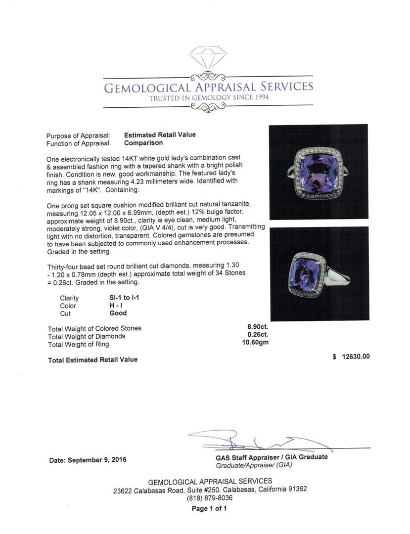 One electronically tested 14KT white gold lady's combination cast & assembled fashion ring with a tapered shank with a bright polish finish. The featured lady's ring has a shank measuring 4.23 millimeters wide. Identified with markings of '14K'. Condition is new, good workmanship. Containing: One prong set square cushion modified brilliant cut natural tanzanite, measuring 12.05 x 12.00 x 6.99mm, (depth est.) 12%. bulge factor, approximate weight of 8.90ct., clarity is eye clean, medium light, moderately strong, violet color, (GIA V 4/4), cut is very good. Transmitting light with no distortion, transparent. Colored gemstones are presumed to have been subjected to commonly used enhancement processes. Graded in the setting. Thirty-Four bead set round brilliant cut diamonds, measuring 1.30 - 1.20 x 0.78mm (depth est.) approximate total weight of 34 Stones = 0.26ct. Graded in the setting. Clarity SI-1 to I-1. Color: H - I Cut Good. Total Weight of Colored Stones 8.90ct.. Total Weight of Diamonds 0.26ct.. Total Weight of Ring 10.60gm GAS Appraised at $12,630.00.