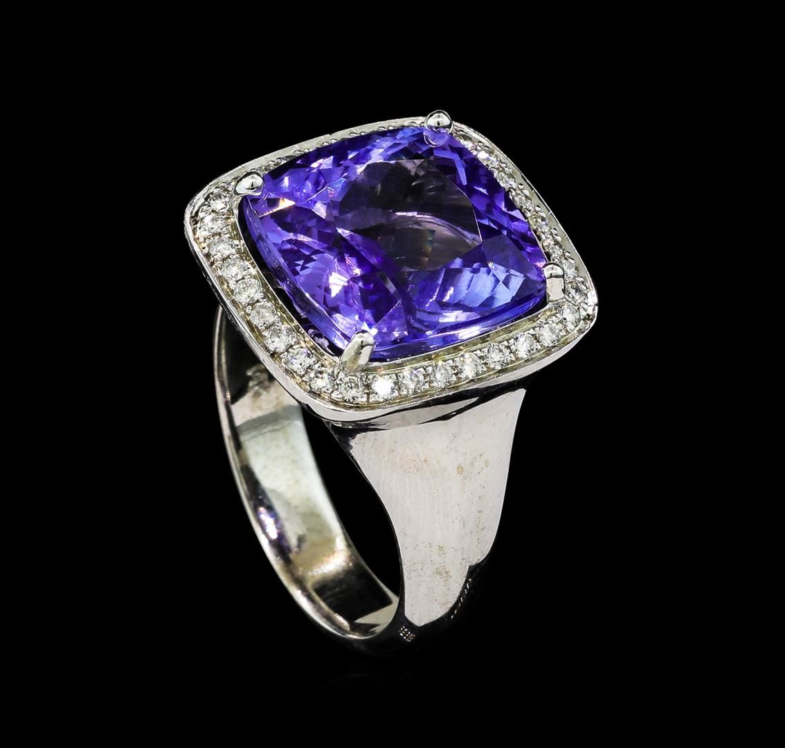 One electronically tested 14KT white gold lady's combination cast & assembled fashion ring with a tapered shank with a bright polish finish. The featured lady's ring has a shank measuring 4.23 millimeters wide. Identified with markings of '14K'. Condition is new, good workmanship. Containing: One prong set square cushion modified brilliant cut natural tanzanite, measuring 12.05 x 12.00 x 6.99mm, (depth est.) 12%. bulge factor, approximate weight of 8.90ct., clarity is eye clean, medium light, moderately strong, violet color, (GIA V 4/4), cut is very good. Transmitting light with no distortion, transparent. Colored gemstones are presumed to have been subjected to commonly used enhancement processes. Graded in the setting. Thirty-Four bead set round brilliant cut diamonds, measuring 1.30 - 1.20 x 0.78mm (depth est.) approximate total weight of 34 Stones = 0.26ct. Graded in the setting. Clarity SI-1 to I-1. Color: H - I Cut Good. Total Weight of Colored Stones 8.90ct.. Total Weight of Diamonds 0.26ct.. Total Weight of Ring 10.60gm GAS Appraised at $12,630.00.