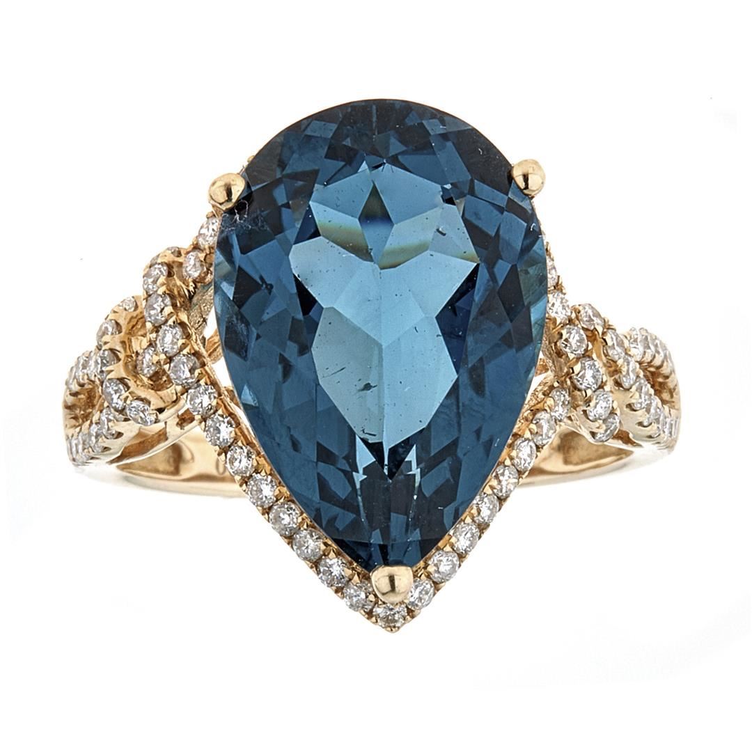 One Lady's Topaz and Diamond Ring. Setting: 14 Kt. Yellow Gold Mounting. Additional: 75 Round Diamonds = 0.50 Cts. TWT (G-H/VS-SI). Center Gem Stone Information: Species: Natural Topaz. Variety: Topaz. Shape and Cut: Pear Mixed Cut. Measurements: 16.80 x 10.96 x 7.08 mm. Weight: 8.90 Carats. Transparency: Transparent. Color Hue: Blue. Saturation: Moderately Strong. Total Weight: 3.21 grams.