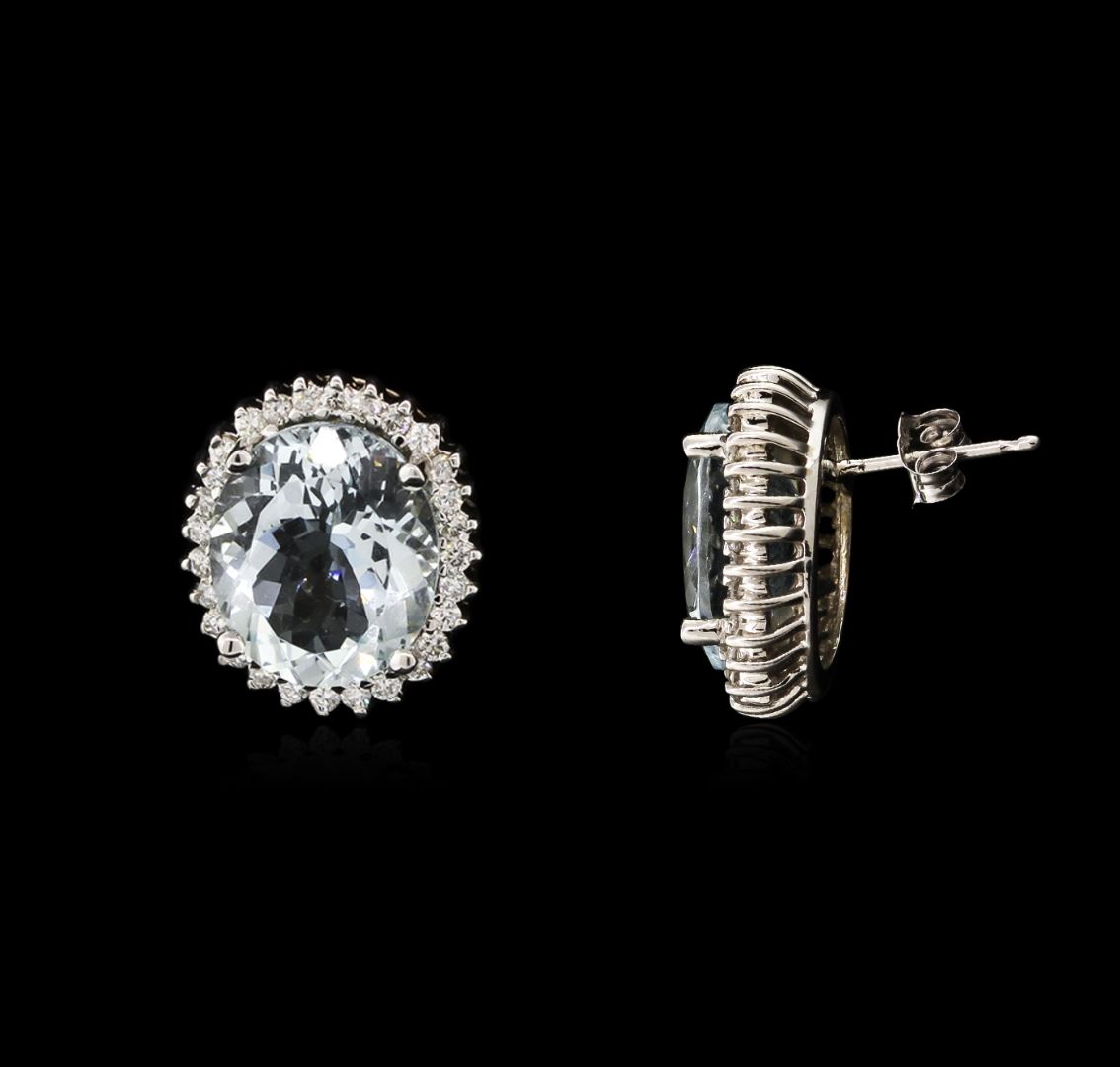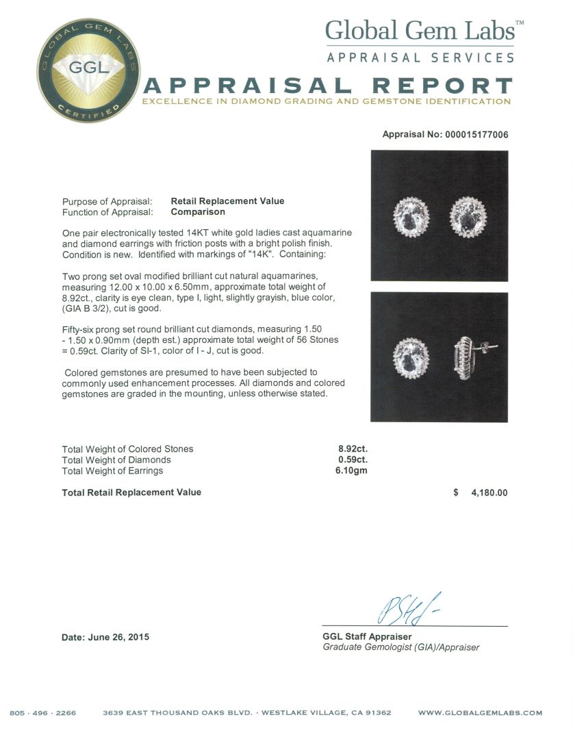 One pair electronically tested 14KT white gold ladies cast aquamarine and diamond earrings with friction posts with a bright polish finish. Identified with markings of "14K". Condition is new. Containing: Two prong set oval modified brilliant cut natural aquamarines, measuring 12.00 x 10.00 x 6.50mm, approximate total weight of 8.92ct., clarity is eye clean, type I, light, slightly grayish, blue color, (GIA B 3/2), cut is good. Fifty-Six prong set round brilliant cut diamonds, measuring 1.50 - 1.50 x 0.90mm (depth est.) approximate total weight of 56 Stones = 0.59ct. Clarity: SI-1. Color: I - J, Cut is Good. Colored gemstones are presumed to have been subjected to commonly used enhancement processes. All diamonds and colored gemstones are graded in the mounting, unless otherwise stated. Total Weight of Colored Stones 8.92ct. Total Weight of Diamonds 0.59ct. Total Weight of Earrings 6.10 grams. GGL Appraised at $4,180.00.