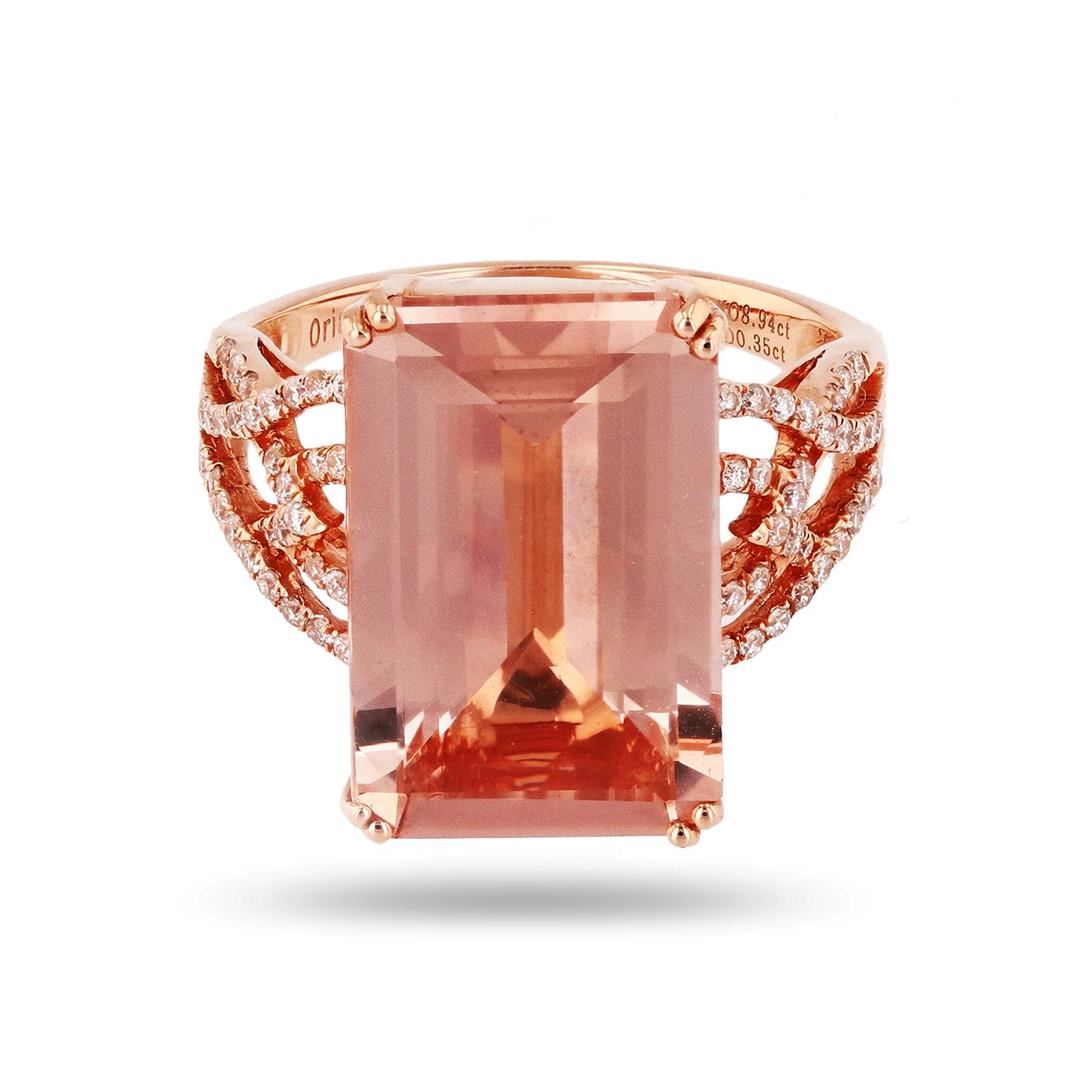 One electronically tested 14KT rose gold ladies cast morganite and diamond ring with a bright polish finish. Condition is new, good workmanship. The featured morganite is set within a rose gold basket supported by stylized diamond set shoulders, completed by a two millimeter wide band. Trademark is Orianne. Identified with markings of "14K". Containing: One prong set rectangular step cut natural morganite, measuring 16.90 x 11.00 x 7.00mm, approximate weight of 8.94ct., clarity is eye clean, type I, light, slightly brownish, red orange color, (GIA RO 3/2), cut is good. Transmitting light with no distortion, transparent. Graded in the setting. Sixty-six prong set round brilliant cut diamonds approximate total weight of 66 Stones = 0.35ct. Graded in the setting. Clarity SI-2 to I-2 Color F-H Total Weight of Colored Stones 8.94ct. Total Weight of Diamonds 0.35ct. Total Weight of Ring 6.81 gm