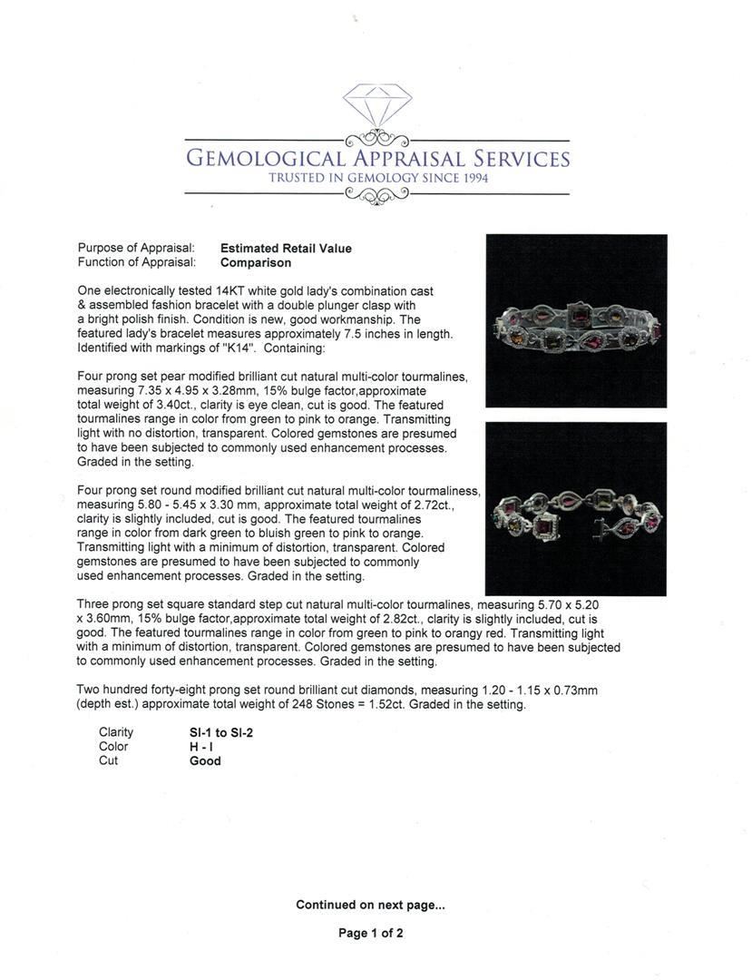 One electronically tested 14KT white gold lady's combination cast & assembled fashion bracelet with a double plunger clasp with a bright polish finish. The featured lady's bracelet measures approximately 7.5 inches in length. Identified with markings of "K14". Condition is new, good workmanship. Containing: Four prong set pear modified brilliant cut natural multi-color tourmalines, measuring 7.35 x 4.95 x 3.28mm, 15%. bulge factor, approximate total weight of 3.40 ct., clarity is eye clean, cut is good. The featured tourmalines range in color from green to pink to orange. Transmitting light with no distortion, transparent. Colored gemstones are presumed to have been subjected to commonly used enhancement processes. Graded in the setting. Four prong set round modified brilliant cut natural multi-color tourmalines, measuring 5.80 - 5.45 x 3.30 mm, approximate total weight of 2.72ct., clarity is slightly included, cut is good. The featured tourmalines range in color from dark green to bluish green to pink to orange. Transmitting light with a minimum of distortion, transparent. Colored gemstones are presumed to have been subjected to commonly used enhancement processes. Graded in the setting. Three prong set square standard step cut natural multi-color tourmalines, measuring 5.70 x 5.20 x 3.60mm, 15%. bulge factor, approximate total weight of 2.82ct., clarity is slightly included, cut is good. The featured tourmalines range in color from green to pink to orangy red. Transmitting light with a minimum of distortion, transparent. Colored gemstones are presumed to have been subjected to commonly used enhancement processes. Graded in the setting. Two Hundred Forty-Eight prong set round brilliant cut diamonds, measuring 1.20 - 1.15 x 0.73mm (depth est.) approximate total weight of 248 Stones = 1.52ct. Graded in the setting. Clarity: SI-1 to SI-2. Color: H - I. Cut Good. Total Weight of Colored Stones 8.94ct. Total Weight of Diamonds 1.52ct. Total Weight of Bracelet 18.40gm. GAS Appraised.