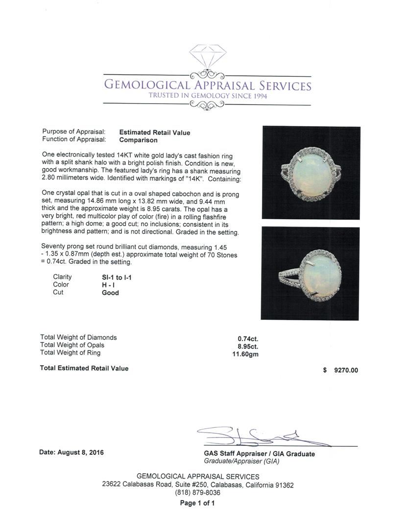 One electronically tested 14KT white gold lady's cast fashion ring with a split shank halo with a bright polish finish. The featured lady's ring has a shank measuring 2.80 millimeters wide. Identified with markings of '14K'. Condition is new, good workmanship. Containing: One crystal opal that is cut in a oval shaped cabochon and is prong set, measuring 14.86 mm long x 13.82 mm wide, and 9.44 mm thick and the approximate weight is 8.95 carats. The opal has a very bright, red multicolor play of color (fire) in a rolling flashfire pattern; a high dome; a good cut; no inclusions; consistent in its brightness and pattern; and is not directional. Graded in the setting. Seventy prong set round brilliant cut diamonds, measuring 1.45 - 1.35 x 0.87mm (depth est.) approximate total weight of 70 Stones = 0.74ct. Graded in the setting. Clarity SI-1 to I-1. Color: H - I Cut Good. Total Weight of Diamonds 0.74ct.. Total Weight of Opals 8.95ct.. Total Weight of Ring 11.60gm. GAS Appraised at $9,270.00.