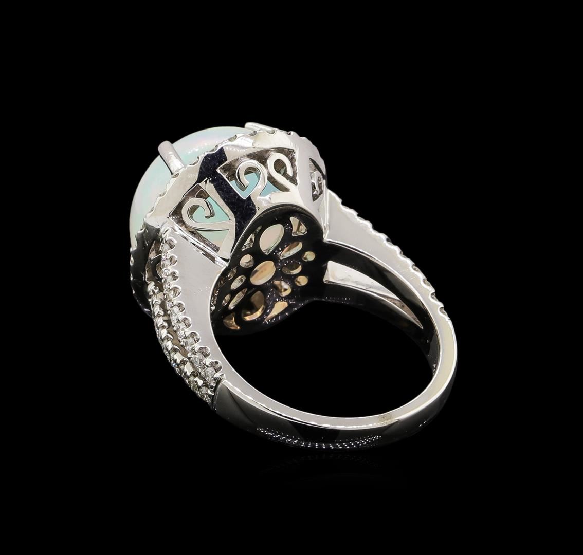 One electronically tested 14KT white gold lady's cast fashion ring with a split shank halo with a bright polish finish. The featured lady's ring has a shank measuring 2.80 millimeters wide. Identified with markings of '14K'. Condition is new, good workmanship. Containing: One crystal opal that is cut in a oval shaped cabochon and is prong set, measuring 14.86 mm long x 13.82 mm wide, and 9.44 mm thick and the approximate weight is 8.95 carats. The opal has a very bright, red multicolor play of color (fire) in a rolling flashfire pattern; a high dome; a good cut; no inclusions; consistent in its brightness and pattern; and is not directional. Graded in the setting. Seventy prong set round brilliant cut diamonds, measuring 1.45 - 1.35 x 0.87mm (depth est.) approximate total weight of 70 Stones = 0.74ct. Graded in the setting. Clarity SI-1 to I-1. Color: H - I Cut Good. Total Weight of Diamonds 0.74ct.. Total Weight of Opals 8.95ct.. Total Weight of Ring 11.60gm. GAS Appraised at $9,270.00.