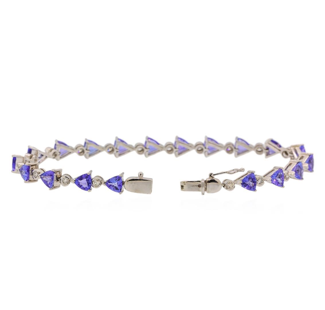 One electronically tested 14KT white gold lady's combination cast & assembled fashion bracelet with a tongue clasp with foldover safety with a bright polish finish. The featured lady's bracelet measures 7.5 inches in length. Identified with markings of '14K'. Condition is new, good workmanship. Containing: Nineteen prong set triangle modified brilliant cut natural tanzanites, measuring 5.30 x 5.25 x 2.76mm, (depth est.) approximate total weight of 8.96ct., clarity is eye clean, medium, moderately strong, bluish violet color, (GIA bV 5/4), cut is good. Transmitting light with no distortion, transparent. Colored gemstones are presumed to have been subjected to commonly used enhancement processes. Graded in the setting. Nineteen prong set round brilliant cut diamonds, measuring 2.55 - 2.45 x 1.53mm (depth est.) approximate total weight of 19 Stones = 1.10ct. Graded in the setting. Clarity VS-2 to SI-1. Color: H - I Cut Good. Total Weight of Colored Stones 8.96ct.. Total Weight of Diamonds 1.10ct.. Total Weight of Bracelet 12.20gm. GAS Appraised at $11,105.00.