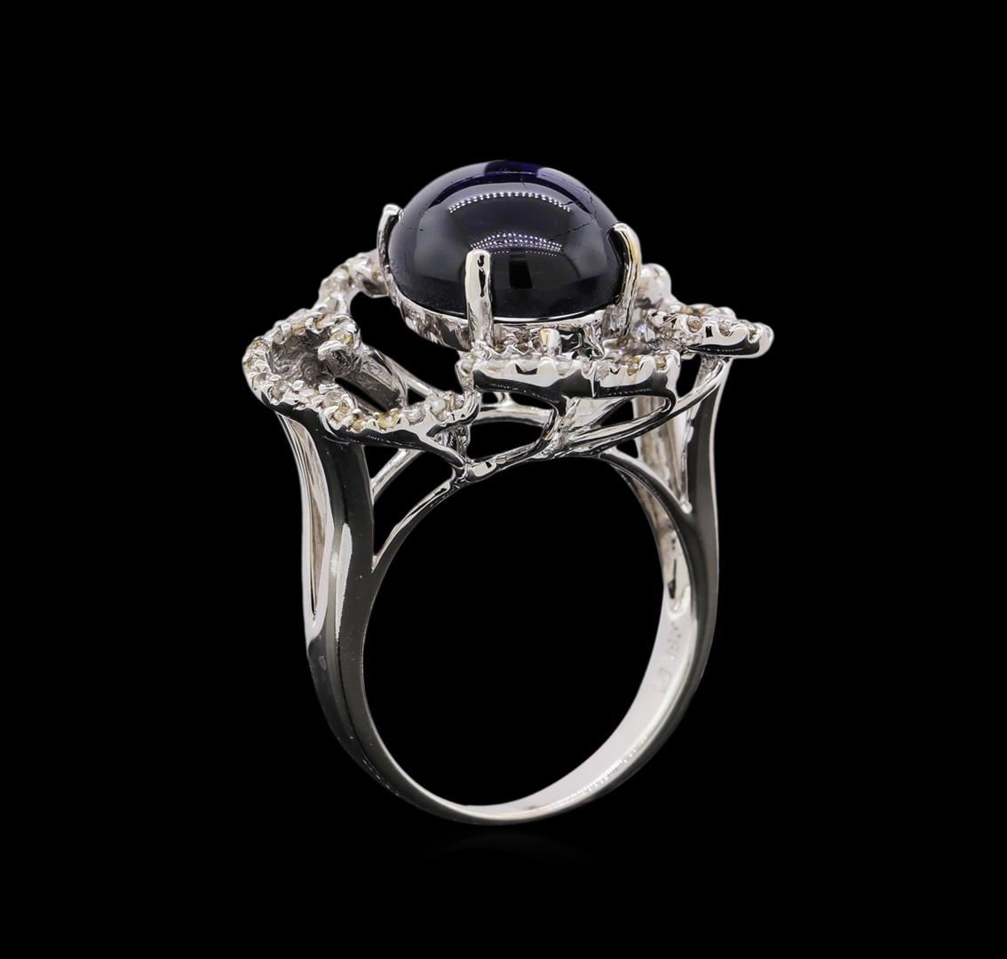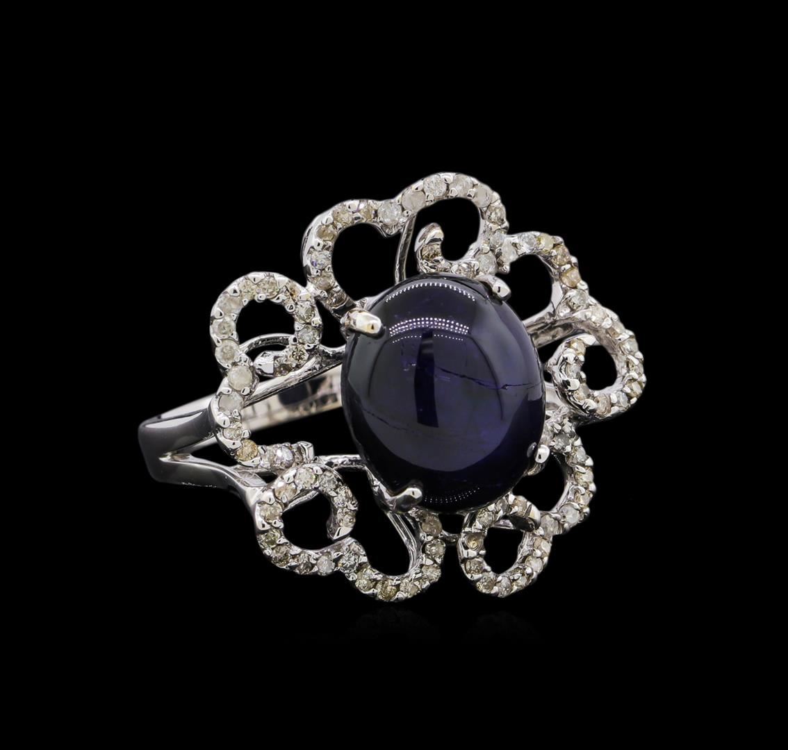 One electronically tested 18KT white gold ladies cast star sapphire and diamond ring with a bright polish finish. The featured star sapphire is set within a stylized diamond set floral bezel, completed by a two and one-half millimeter wide band. Identified with markings of "18K". Condition is new, good workmanship. Containing: One prong set oval cabochon cut natural blue star sapphire approximate weight of 8.99ct., medium dark, very slightly grayish, violetish blue color, (GIA vB 6/3), cut is good. This stone has a complete six ray star with strong intensity and good movement. Transmitting light very diffusely, opaque. Naturally occurring internal & external characteristics are present. Indications of laboratory high temperature diffusion treatment. Graded in the setting. Eighty-Five prong set round brilliant cut diamonds approximate total weight of 85 Stones = 0.60ct. Graded in the setting. Clarity: I-1 to I-2. Color: I - K. Total Weight of Colored Stones 8.99ct. Total Weight of Diamonds 0.60ct. Total Weight of Ring 9.57gm. AIG Appraised at $5,725.00.