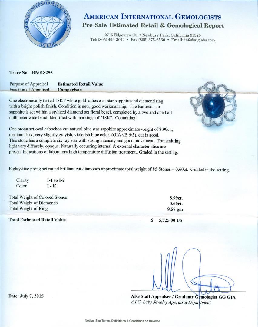 One electronically tested 18KT white gold ladies cast star sapphire and diamond ring with a bright polish finish. The featured star sapphire is set within a stylized diamond set floral bezel, completed by a two and one-half millimeter wide band. Identified with markings of "18K". Condition is new, good workmanship. Containing: One prong set oval cabochon cut natural blue star sapphire approximate weight of 8.99ct., medium dark, very slightly grayish, violetish blue color, (GIA vB 6/3), cut is good. This stone has a complete six ray star with strong intensity and good movement. Transmitting light very diffusely, opaque. Naturally occurring internal & external characteristics are present. Indications of laboratory high temperature diffusion treatment. Graded in the setting. Eighty-Five prong set round brilliant cut diamonds approximate total weight of 85 Stones = 0.60ct. Graded in the setting. Clarity: I-1 to I-2. Color: I - K. Total Weight of Colored Stones 8.99ct. Total Weight of Diamonds 0.60ct. Total Weight of Ring 9.57gm. AIG Appraised at $5,725.00.