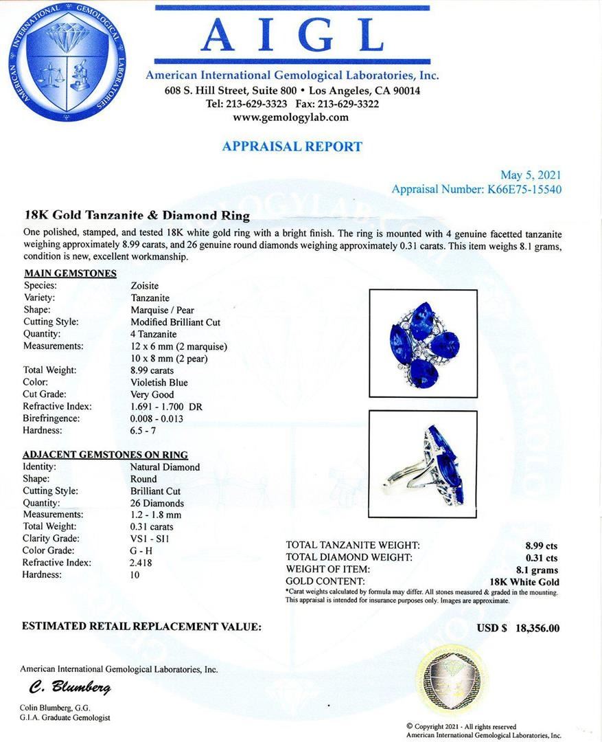 8.99ctw Tanzanite and 0.31ctw Diamond 18K White Gold Ring. One polished, stamped, and tested 18K white gold ring with a bright finish. The ring is mounted with 4 genuine facetted tanzanite weighing approximately 8.99 carats, and 26 genuine round diamonds weighing approximately 0.31 carats. This item weighs 8.1 grams, condition is new, excellent workmanship. MAIN GEMSTONES Species: Zoisite Variety: Tanzanite Shape: Marquise / Pear Cutting Style: Modified Brilliant Cut Quantity: 4 Tanzanite Measurements: 12 x 6mm (2 marquise) 10 x 8mm (2 pear) Total Weight: 8.99 carats Color: Violetish Blue Cut Grade: Very Good Refractive Index: 1.691 - 1.700 DR Birefringence: 0.008 - 0.013 Hardness: 6.5 - 7 ADJACENT GEMSTONES ON RING Identity: Natural Diamond Shape: Round Cutting Style: Brilliant Cut Quantity: 26 Diamonds Measurements: 1.2 - 1.8mm Total Weight: 0.31 carats Clarity Grade: VSI to SI1 Color Grade: G - H Refractive Index: 2.418 Hardness: 10 TOTAL TANZANITE WEIGHT: 8.99ctw TOTAL DIAMOND WEIGHT: 0.31ctw WEIGHT OF ITEM: 8.1 grams GOLD CONTENT: 18K White Gold