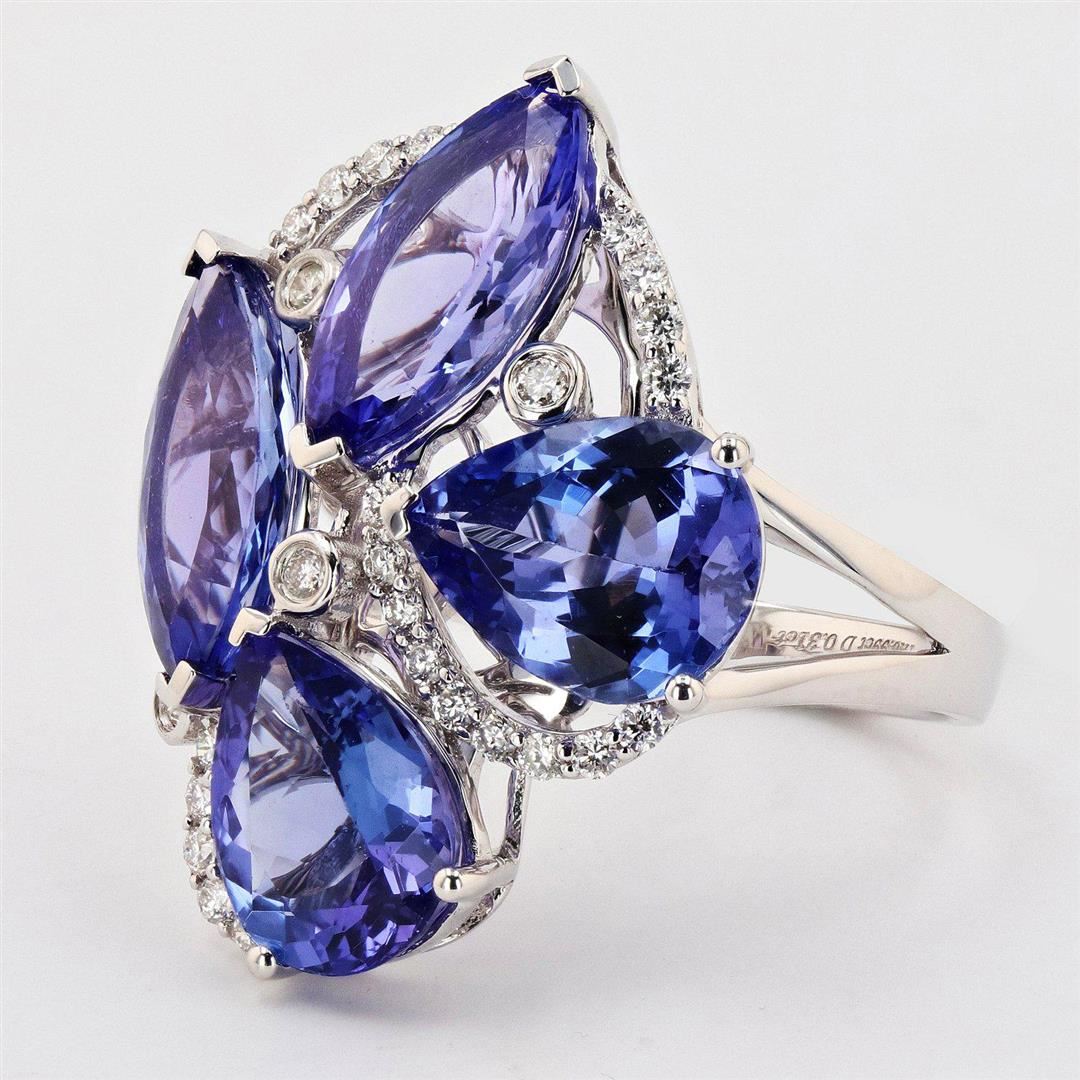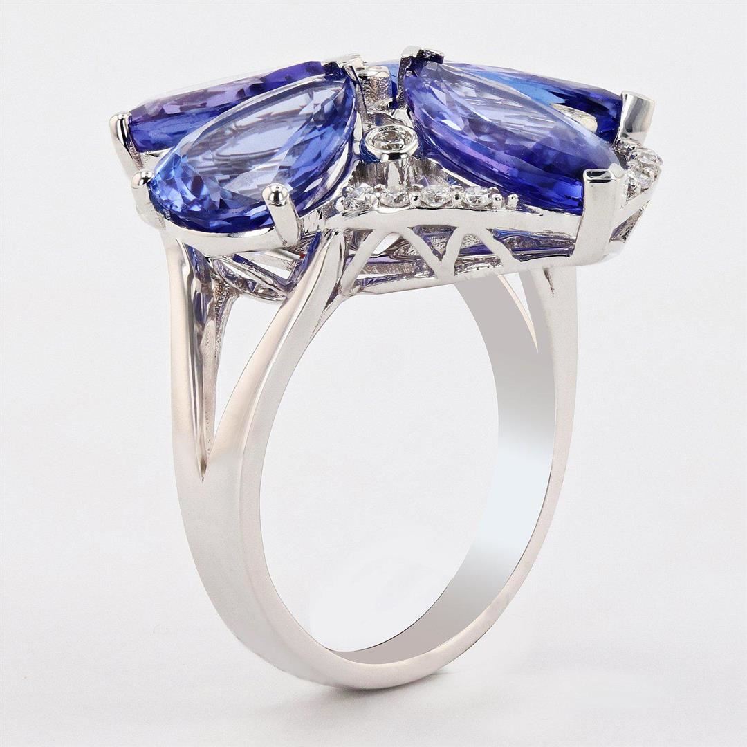 8.99ctw Tanzanite and 0.31ctw Diamond 18K White Gold Ring. One polished, stamped, and tested 18K white gold ring with a bright finish. The ring is mounted with 4 genuine facetted tanzanite weighing approximately 8.99 carats, and 26 genuine round diamonds weighing approximately 0.31 carats. This item weighs 8.1 grams, condition is new, excellent workmanship. MAIN GEMSTONES Species: Zoisite Variety: Tanzanite Shape: Marquise / Pear Cutting Style: Modified Brilliant Cut Quantity: 4 Tanzanite Measurements: 12 x 6mm (2 marquise) 10 x 8mm (2 pear) Total Weight: 8.99 carats Color: Violetish Blue Cut Grade: Very Good Refractive Index: 1.691 - 1.700 DR Birefringence: 0.008 - 0.013 Hardness: 6.5 - 7 ADJACENT GEMSTONES ON RING Identity: Natural Diamond Shape: Round Cutting Style: Brilliant Cut Quantity: 26 Diamonds Measurements: 1.2 - 1.8mm Total Weight: 0.31 carats Clarity Grade: VSI to SI1 Color Grade: G - H Refractive Index: 2.418 Hardness: 10 TOTAL TANZANITE WEIGHT: 8.99ctw TOTAL DIAMOND WEIGHT: 0.31ctw WEIGHT OF ITEM: 8.1 grams GOLD CONTENT: 18K White Gold