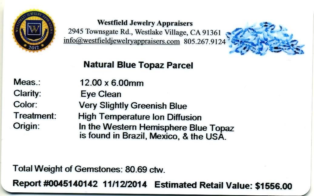 80.69cts Marquise Cut Natural Blue Topaz Parcel. Westfield Appraised at $1,556.00.