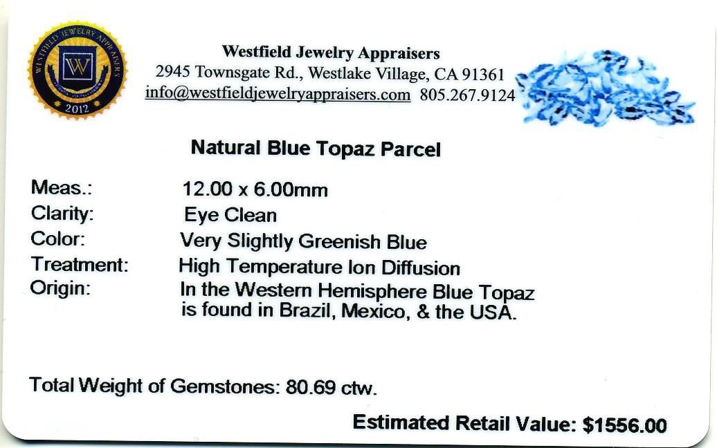 80.69cts Marquise Cut Natural Blue Topaz Parcel. Westfield Appraised at $1,556.00.