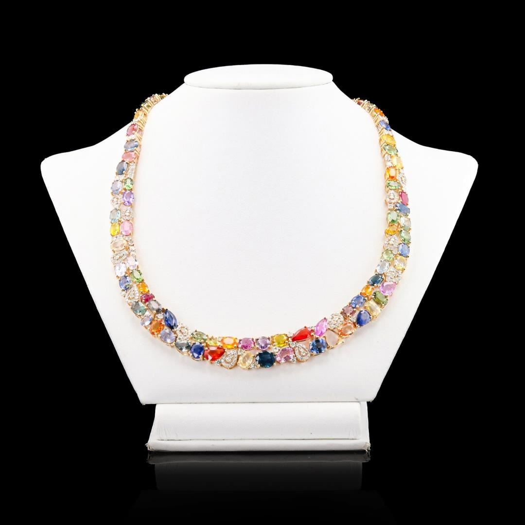 One polished, stamped, and tested 14K yellow gold necklace marked Oscar Friedman The necklace is mounted with 85 genuine sapphires weighing approximately 81.38 carats, and 191 genuine round diamonds weighing approximately 3.63 carats. The necklace measures 18 inches in length and is finished with a tension locking clasp and folding safety clasp. This item weighs 46.0 grams. condition is new, excellent workmanship. #MAIN GEMSTONES# Species: Natural Corundum Variety: Sapphire Shape: Pear / Oval / Round / Marquise Quantity: 85 Sapphires Measurements: 5 x 4 - 9 x 6mm (8 pear), 5 x 4 - 8 x 7mm (74 oval), 5.3mm (1 round), 9.5 x 4.5 - 11 x 5mm (2 marquise) Total Weight: 81.38 carats Color: Various Colors Transparency: Transparent Refractive Index: 1.762 - 1.770 DR Birefringence: 0.008 - 0.010 Hardness: 9 #ADJACENT GEMSTONES ON NECKLACE# Identity: Natural Diamond Shape: Round Quantity: 191 Diamonds Measurements: 1.0 - 2.0mm Total Weight: 3.63 carats Color Grade: G-I Clarity Grade: SI1-I2 Refractive Index: 2.417 Hardness: 10 TOTAL SAPPHIRE WEIGHT: 81.38 cts TOTAL DIAMOND WEIGHT: 3.63 cts WEIGHT OF ITEM: 46.0 grams GOLD CONTENT: 14K Yellow Gold #LREF-15542