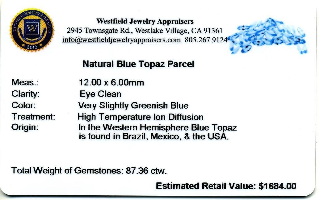 87.36cts Marquise Cut Natural Blue Topaz Parcel. Westfield Appraised at $1,684.00.