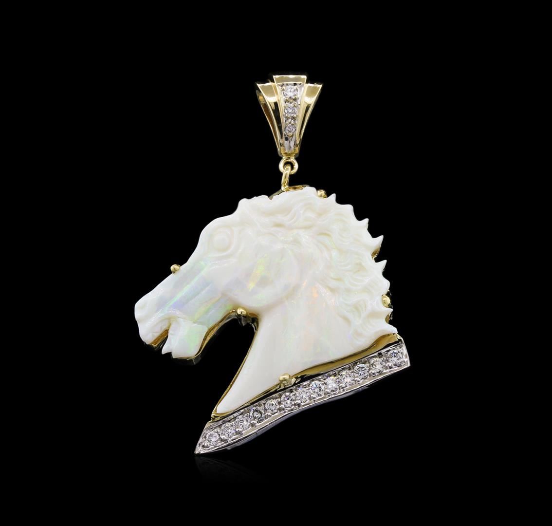 One electronically tested 14KT yellow and white gold lady's combination cast & assembled horse head shape pendant with a bright polish finish. Identified with markings of "14K". Condition is like new, good workmanship. Containing: One crystal opal that is cut in a free-form shape and is prong set, measuring 20.00 mm long x 25.00 mm wide, and 14.00 mm thick and the approximate weight is 9.00 carats. The opal has a bright, multicolor play of color (fire) in a broad flashfire pattern; a very irregular dome; a good cut; slightly included; consistent in its brightness and pattern; and is very directional. Graded in the setting. Thirteen bead set round brilliant cut diamonds, measuring 1.80 - 1.70 x 1.05mm (depth est.) approximate total weight of 13 Stones = 0.26ct. Graded in the setting. Clarity: SI-1 to SI-2. Color: G - Very Good Three prong set round brilliant cut diamonds, measuring 1.50 - 1.20 x 0.81mm (depth est.) approximate total weight of 3 Stones = 0.03ct. Graded in the setting. Clarity: SI-1 to SI-2. Color: G - Good. Total Weight of Diamonds 0.28ct. Total Weight of Opals 9.00ct. Total Weight of Pendant 10.30gm. GAS Appraised at $3,895.00.