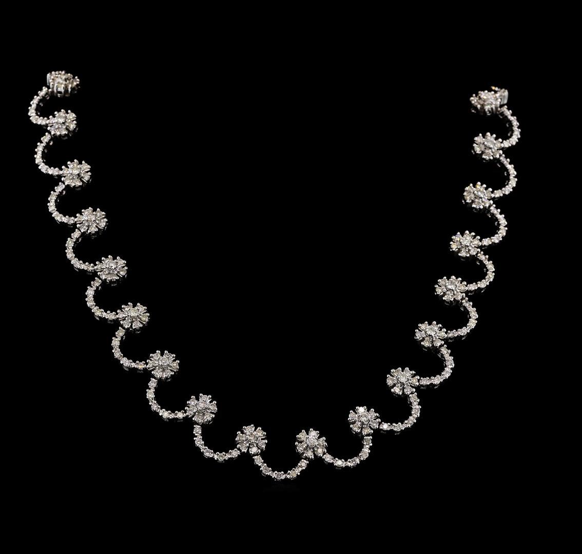 One electronically tested 14KT white gold ladies cast and assembled diamond necklace. Condition is good. Seventeen and on-half inch length necklace features a garland of diamond florets connected by scalloped diamond ribbons, terminating in a concealed clasp with safety. Bright polish finish. Identified with marking of "14K". Containing: Twenty-six prong set round brilliant cut diamonds, measuring 2.60 - 2.60 x 1.56mm (depth est.) approximate total weight of 26 stones = 1.67ct. Measurements are an average for the group. Graded in the setting. Clarity of I-2 to I-3, Color of E-G. Two hundred eighty-six prong set round brilliant cut diamonds, measuring 2.00 - 1.90 x 1.17mm (depth est.) approximate total weight of 286 stones = 7.35ct. Graded in the setting. Clarity of I-2 to I-3, Color of F - H. Total Weight of Diamonds: 9.02ct. Total Weight of Necklace: 58.59 gm. AIG Appraised at $25,150.00. AIG Appraised at $25,150.00.