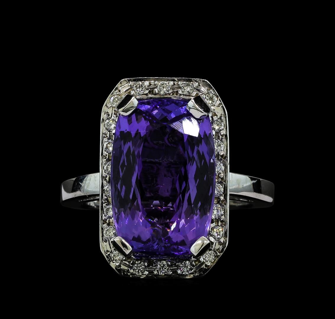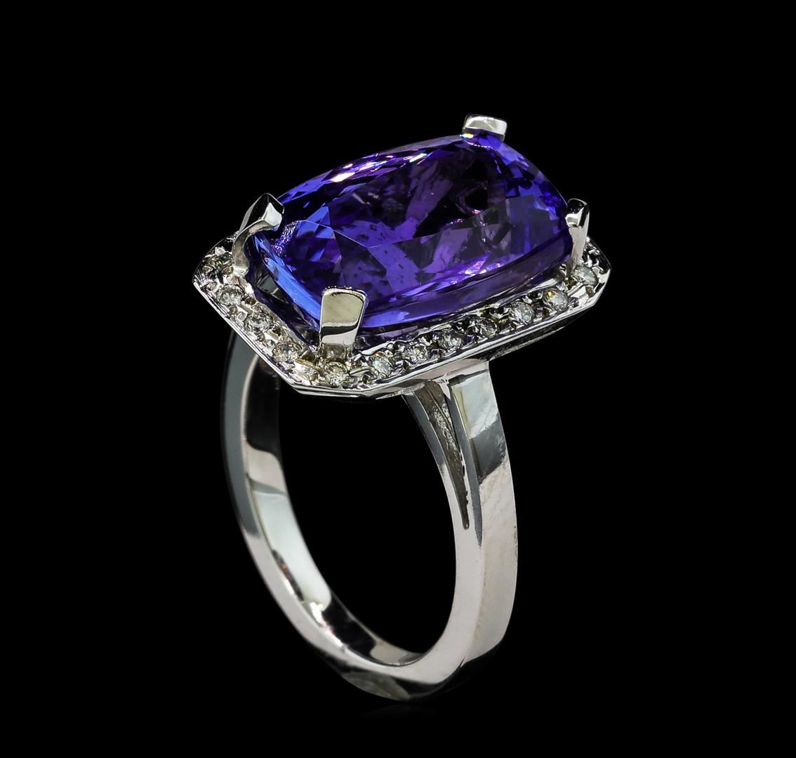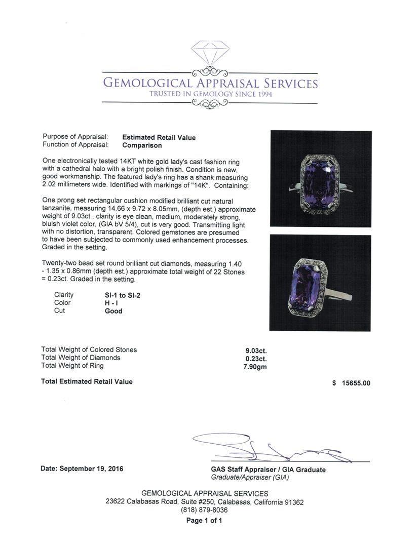 One electronically tested 14KT white gold lady's cast fashion ring with a cathedral halo with a bright polish finish. The featured lady's ring has a shank measuring 2.02 millimeters wide. Identified with markings of '14K'. Condition is new, good workmanship. Containing: One prong set rectangular cushion modified brilliant cut natural tanzanite, measuring 14.66 x 9.72 x 8.05mm, (depth est.) approximate weight of 9.03ct., clarity is eye clean, medium, moderately strong, bluish violet color, (GIA bV 5/4), cut is very good. Transmitting light with no distortion, transparent. Colored gemstones are presumed to have been subjected to commonly used enhancement processes. Graded in the setting. Twenty-Two bead set round brilliant cut diamonds, measuring 1.40 - 1.35 x 0.86mm (depth est.) approximate total weight of 22 Stones = 0.23ct. Graded in the setting. Clarity SI-1 to SI-2. Color: H - I Cut Good. Total Weight of Colored Stones 9.03ct.. Total Weight of Diamonds 0.23ct.. Total Weight of Ring 7.90gm. GAS Appraised at $15,655.00.