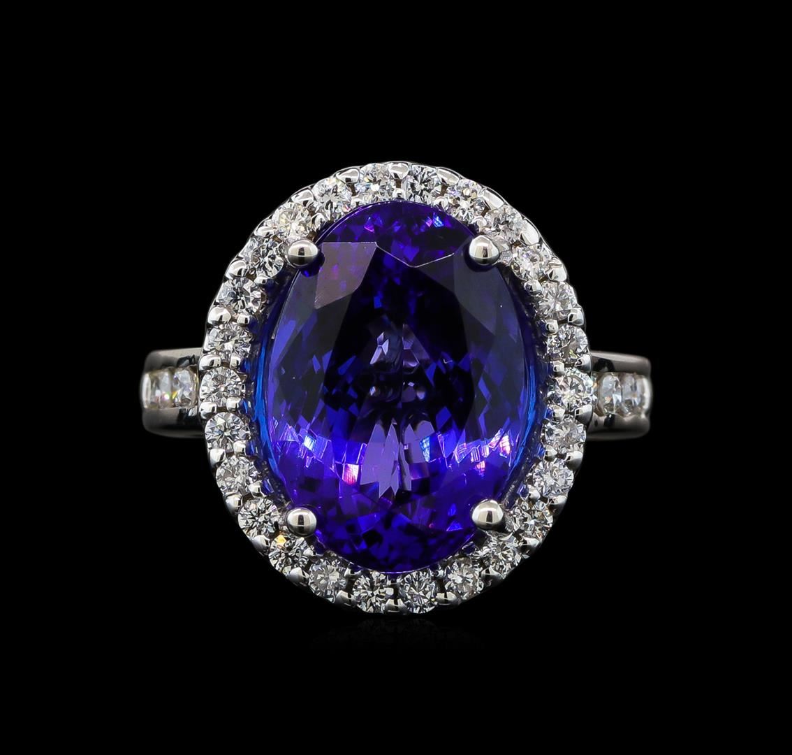One electronically tested 14KT white gold lady's cast fashion ring with a basket halo with a bright polish finish. The featured lady's ring has a shank measuring 3.11 millimeters wide. Identified with markings of '14K'. Condition is new, good workmanship. Containing: One prong set oval modified brilliant cut natural tanzanite, measuring 14.67 x 10.06 x 7.69mm, (depth est.) 13%. bulge factor, approximate weight of 9.04ct., clarity is eye clean, medium dark, moderately strong, violetish blue color, (GIA vB 6/4), cut is very good. Transmitting light with no distortion, transparent. Colored gemstones are presumed to have been subjected to commonly used enhancement processes. Graded loose prior to setting in the GIA Laboratory, Report #2175665834. Ten channel set round brilliant cut diamonds, measuring 2.00 - 1.90 x 1.21mm (depth est.) approximate total weight of 10 Stones = 0.28ct. Graded in the setting. Clarity SI-1 to SI-2. Color: H - I Cut Good Twenty-Six prong set round brilliant cut diamonds, measuring 1.70 - 1.60 x 1.03mm (depth est.) approximate total weight of 26 Stones = 0.45ct. Graded in the setting. Clarity SI-1 to I-1. Color: H - I Cut Good. Total Weight of Colored Stones 9.04ct.. Total Weight of Diamonds 0.73ct.. Total Weight of Ring 8.50gm GAS Appraised at $18,470.00.