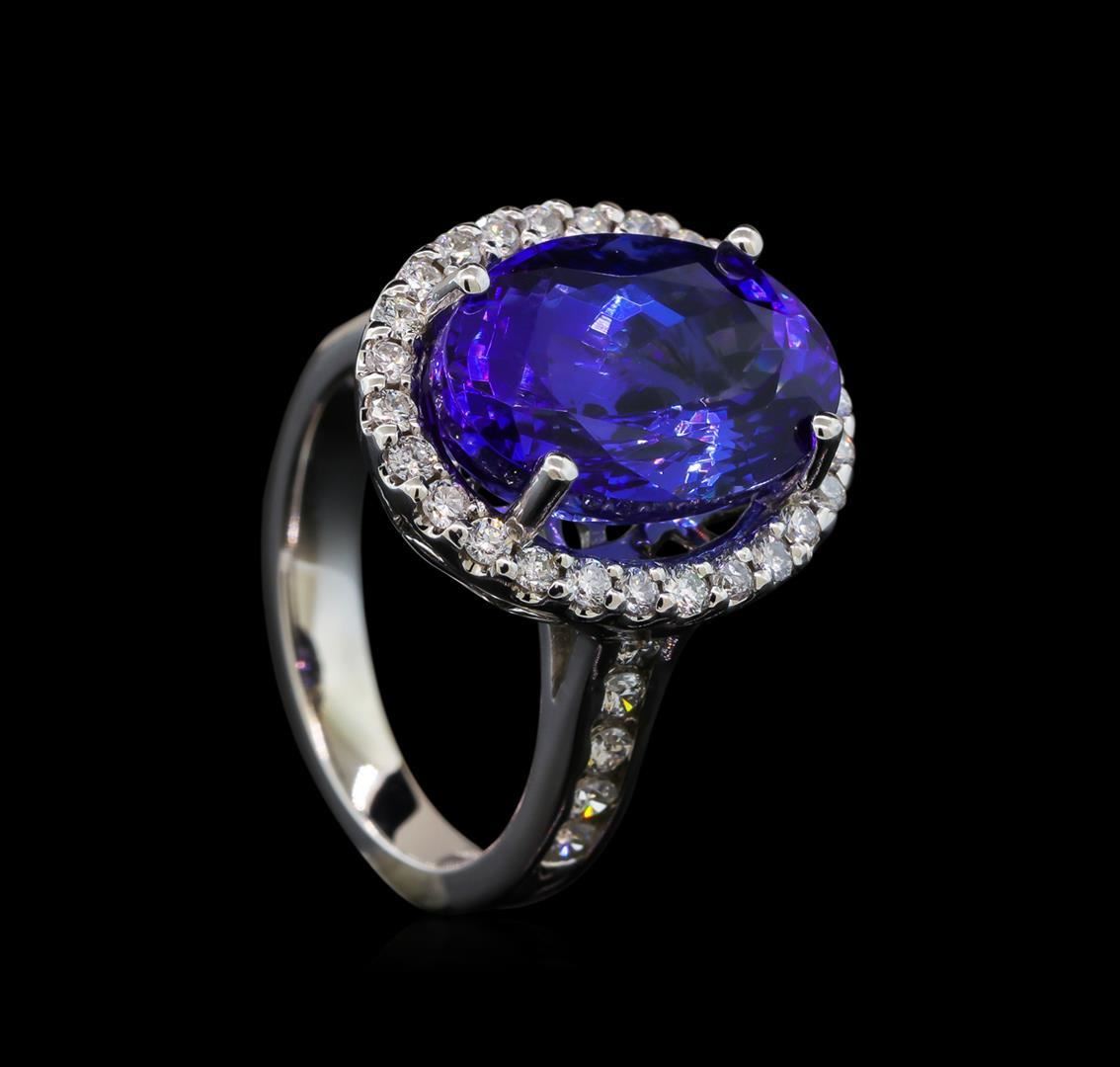 One electronically tested 14KT white gold lady's cast fashion ring with a basket halo with a bright polish finish. The featured lady's ring has a shank measuring 3.11 millimeters wide. Identified with markings of '14K'. Condition is new, good workmanship. Containing: One prong set oval modified brilliant cut natural tanzanite, measuring 14.67 x 10.06 x 7.69mm, (depth est.) 13%. bulge factor, approximate weight of 9.04ct., clarity is eye clean, medium dark, moderately strong, violetish blue color, (GIA vB 6/4), cut is very good. Transmitting light with no distortion, transparent. Colored gemstones are presumed to have been subjected to commonly used enhancement processes. Graded loose prior to setting in the GIA Laboratory, Report #2175665834. Ten channel set round brilliant cut diamonds, measuring 2.00 - 1.90 x 1.21mm (depth est.) approximate total weight of 10 Stones = 0.28ct. Graded in the setting. Clarity SI-1 to SI-2. Color: H - I Cut Good Twenty-Six prong set round brilliant cut diamonds, measuring 1.70 - 1.60 x 1.03mm (depth est.) approximate total weight of 26 Stones = 0.45ct. Graded in the setting. Clarity SI-1 to I-1. Color: H - I Cut Good. Total Weight of Colored Stones 9.04ct.. Total Weight of Diamonds 0.73ct.. Total Weight of Ring 8.50gm GAS Appraised.