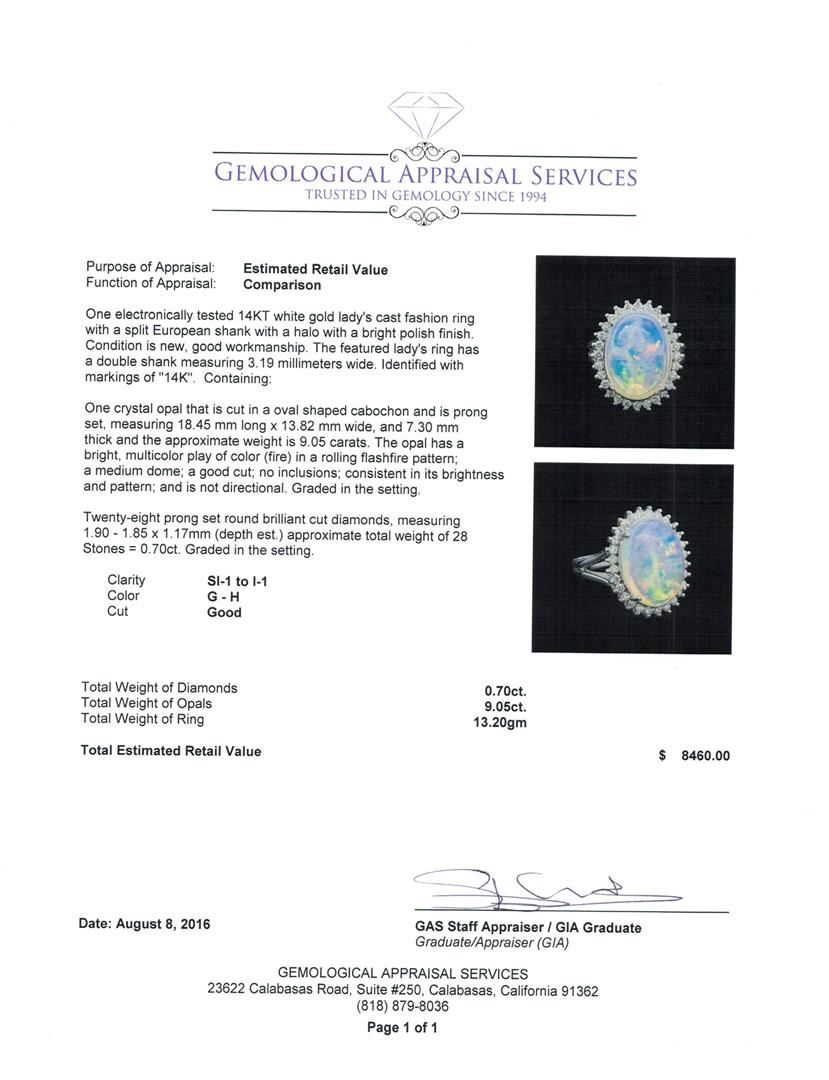 One electronically tested 14KT white gold lady's cast fashion ring with a split European shank with a halo with a bright polish finish. The featured lady's ring has a double shank measuring 3.19 millimeters wide. Identified with markings of '14K'. Condition is new, good workmanship. Containing: One crystal opal that is cut in a oval shaped cabochon and is prong set, measuring 18.45 mm long x 13.82 mm wide, and 7.30 mm thick and the approximate weight is 9.05 carats. The opal has a bright, multicolor play of color (fire) in a rolling flashfire pattern; a medium dome; a good cut; no inclusions; consistent in its brightness and pattern; and is not directional. Graded in the setting. Twenty-Eight prong set round brilliant cut diamonds, measuring 1.90 - 1.85 x 1.17mm (depth est.) approximate total weight of 28 Stones = 0.70ct. Graded in the setting. Clarity SI-1 to I-1. Color: G - H Cut Good. Total Weight of Diamonds 0.70ct.. Total Weight of Opals 9.05ct.. Total Weight of Ring 13.20gm. GAS Appraised at $8,460.00.