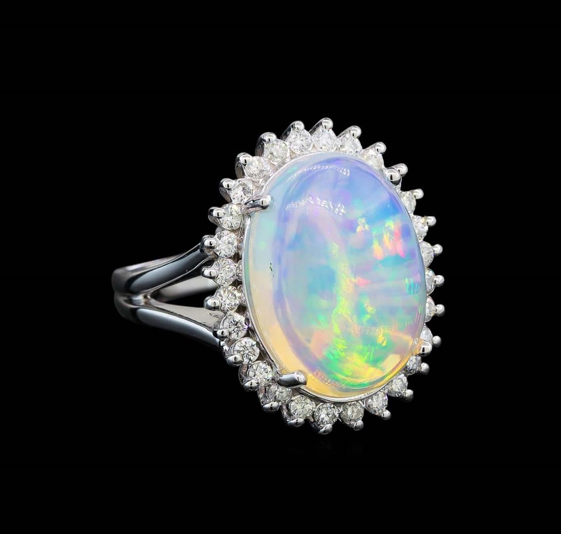 One electronically tested 14KT white gold lady's cast fashion ring with a split European shank with a halo with a bright polish finish. The featured lady's ring has a double shank measuring 3.19 millimeters wide. Identified with markings of '14K'. Condition is new, good workmanship. Containing: One crystal opal that is cut in a oval shaped cabochon and is prong set, measuring 18.45 mm long x 13.82 mm wide, and 7.30 mm thick and the approximate weight is 9.05 carats. The opal has a bright, multicolor play of color (fire) in a rolling flashfire pattern; a medium dome; a good cut; no inclusions; consistent in its brightness and pattern; and is not directional. Graded in the setting. Twenty-Eight prong set round brilliant cut diamonds, measuring 1.90 - 1.85 x 1.17mm (depth est.) approximate total weight of 28 Stones = 0.70ct. Graded in the setting. Clarity SI-1 to I-1. Color: G - H Cut Good. Total Weight of Diamonds 0.70ct.. Total Weight of Opals 9.05ct.. Total Weight of Ring 13.20gm. GAS Appraised at $8,460.00.