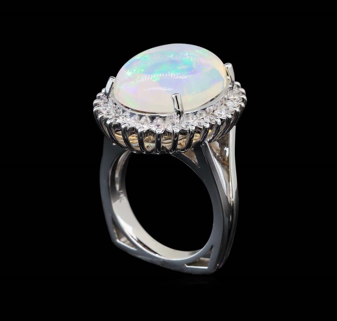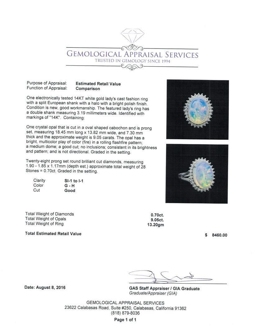 One electronically tested 14KT white gold lady's cast fashion ring with a split European shank with a halo with a bright polish finish. The featured lady's ring has a double shank measuring 3.19 millimeters wide. Identified with markings of '14K'. Condition is new, good workmanship. Containing: One crystal opal that is cut in a oval shaped cabochon and is prong set, measuring 18.45 mm long x 13.82 mm wide, and 7.30 mm thick and the approximate weight is 9.05 carats. The opal has a bright, multicolor play of color (fire) in a rolling flashfire pattern; a medium dome; a good cut; no inclusions; consistent in its brightness and pattern; and is not directional. Graded in the setting. Twenty-Eight prong set round brilliant cut diamonds, measuring 1.90 - 1.85 x 1.17mm (depth est.) approximate total weight of 28 Stones = 0.70ct. Graded in the setting. Clarity SI-1 to I-1. Color: G - H Cut Good. Total Weight of Diamonds 0.70ct.. Total Weight of Opals 9.05ct.. Total Weight of Ring 13.20gm. GAS Appraised.