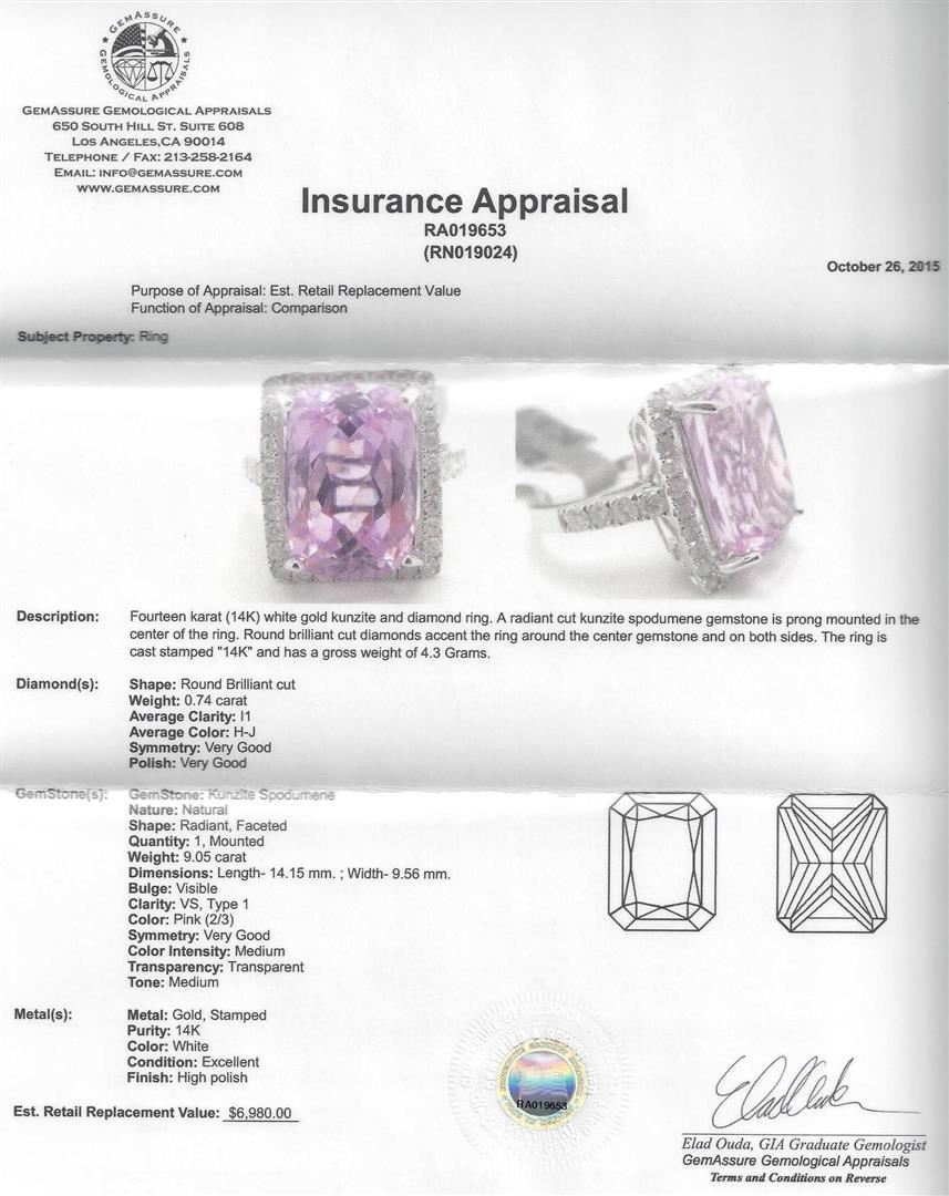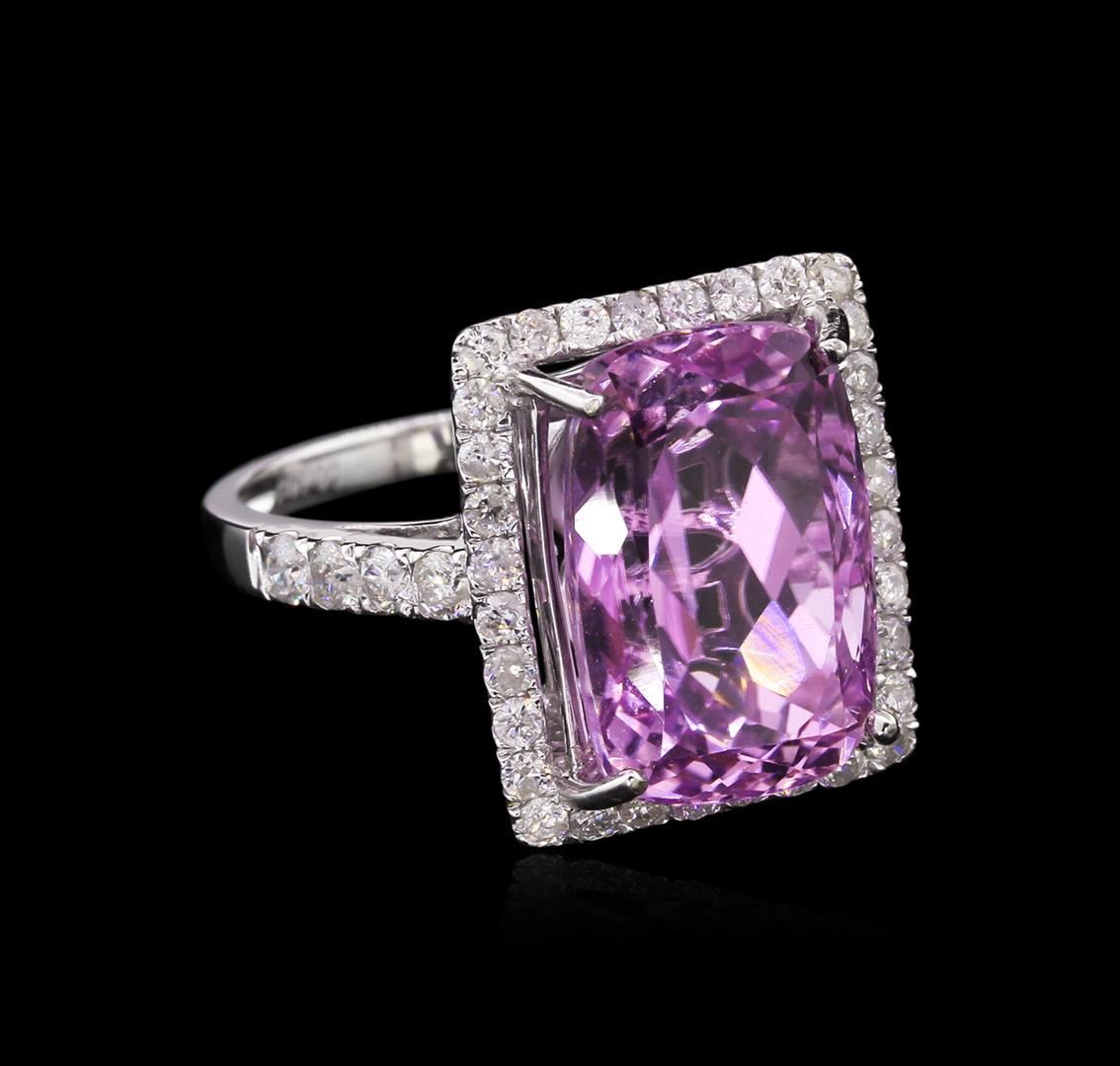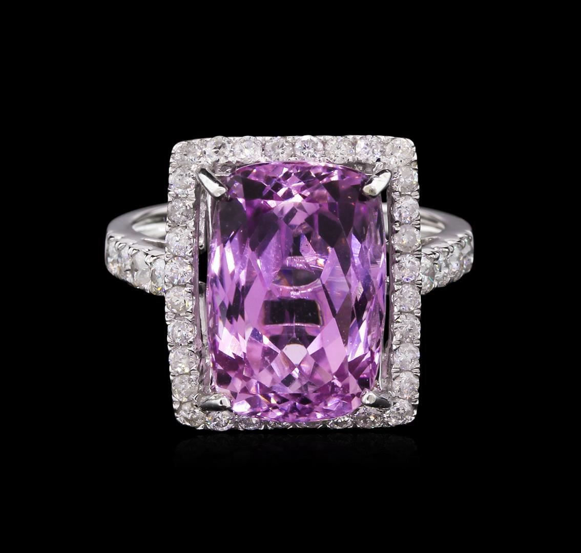 Fourteen karat (14K) white gold kunzite and diamond ring. A radiant cut kunzite spodumene gemstone is prong mounted in the center of the ring. Round brilliant cut diamonds accent the ring around the center gemstone and on both sides. The ring is cast stamped "14K" and has a gross weight of 4.3 Grams. Diamond(s): Shape: Round Brilliant Cut. Weight: 0.74 carat. Average Clarity: I1. Average Color: H-J. Symmetry: Very Good. Polish: Very Good. GemStone(s): GemStone: Sapphire Corundum. Nature: Natural. Shape: Radiant, Faceted. Quantity: 1, Mounted. Weight: 9.05 carat. Dimensions: Length- 14.15 mm. ; Width- 9.56 mm. Bulge: Visible. Clarity: VS, Type 1. Color: Pink: (2/3). Symmetry: Very Good. Color Intensity: Medium. Transparency: Transparent. Tone: Medium. Metal(s): Metal: Gold, Stamped. Purity: 14K. Color: White. Condition: Excellent. Finish: High polish. GGA Appraised.
