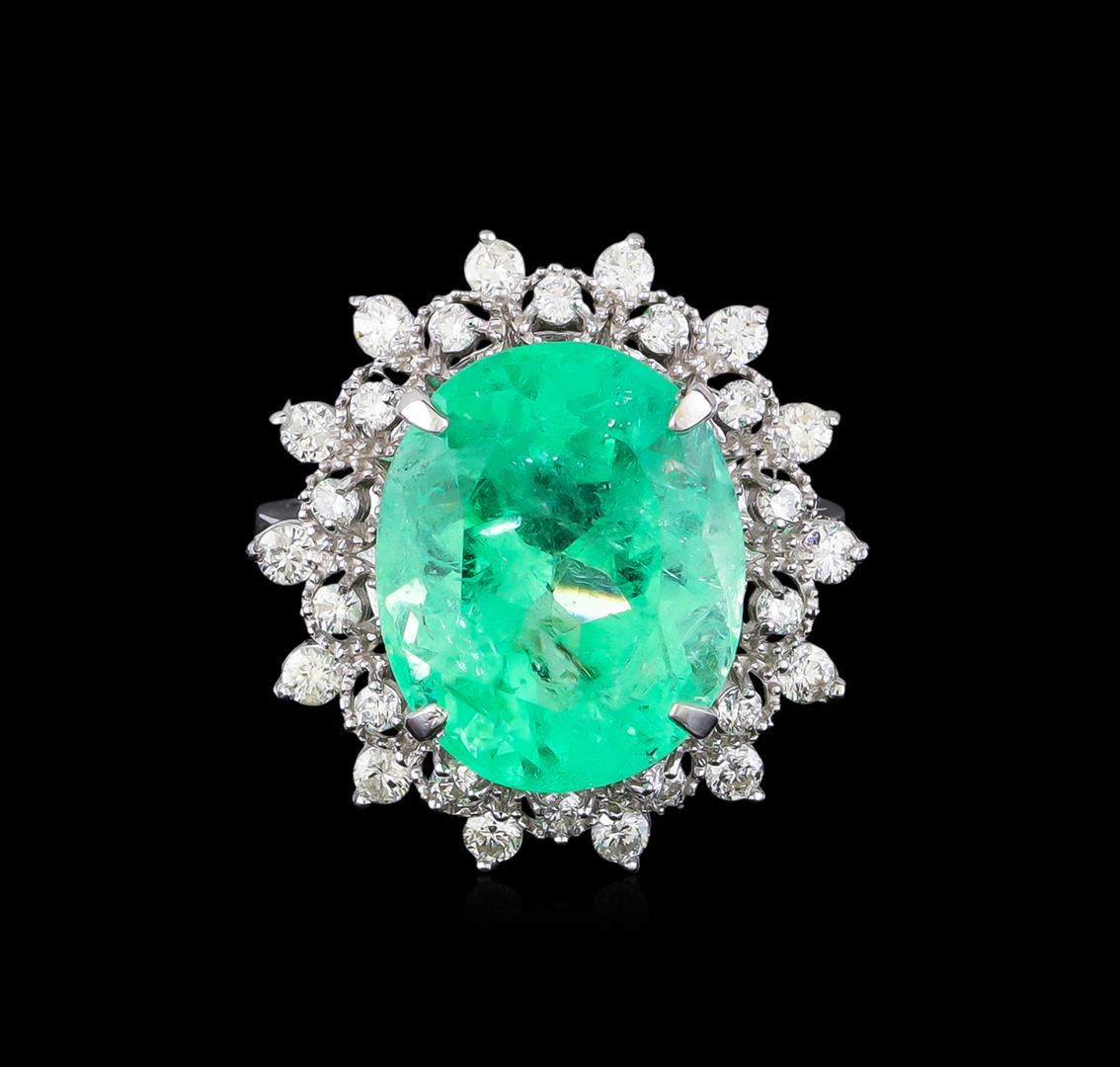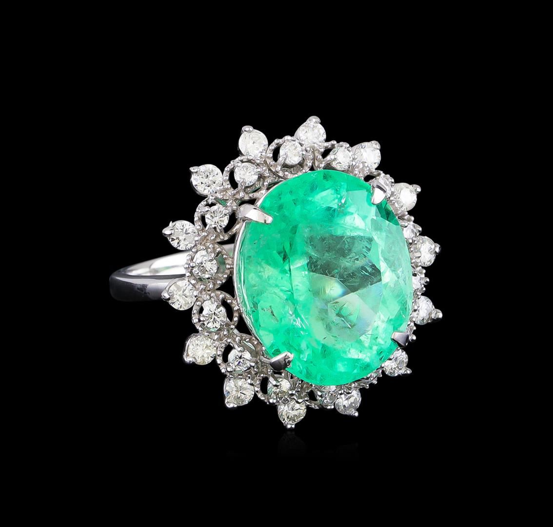 One electronically tested 14KT white gold lady's cast fashion ring with a double basket halo with a bright polish finish. The featured lady's ring has a shank measuring 2.36 millimeters in width. Identified with markings of "K14". Condition is new, good workmanship. Containing: One prong set oval modified brilliant cut natural emerald, measuring 14.85 x 12.19 x 8.89mm, (depth est.) approximate weight of 9.08ct., clarity is moderately included, medium light, moderately strong, green color, (GIA G 4/4), cut is very good. Transmitting light with a minimum of distortion, transparent. Colored gemstones are presumed to have been subjected to commonly used enhancement processes. Indications of oil residue. Graded in the setting. Fourteen prong set round brilliant cut diamonds, measuring 2.10 - 2.00 x 1.27mm (depth est.) approximate total weight of 14 Stones = 0.45ct. Graded in the setting. Clarity: SI-1 to SI-2. Color: G - Good Fourteen prong set round brilliant cut diamonds, measuring 1.80 - 1.70 x 1.07mm (depth est.) approximate total weight of 14 Stones = 0.28ct. Graded in the setting. Clarity: VS-2 to SI-2. Color: G - Good. Total Weight of Colored Stones 9.08ct. Total Weight of Diamonds 0.73ct. Total Weight of Ring 6.50gm GAS Appraised at $21,270.00.
