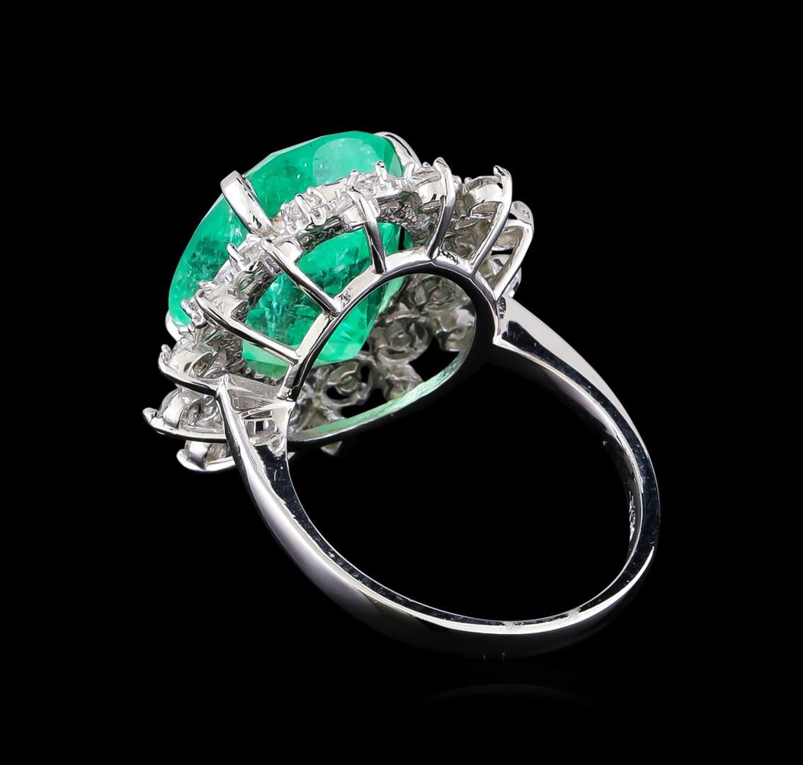 One electronically tested 14KT white gold lady's cast fashion ring with a double basket halo with a bright polish finish. The featured lady's ring has a shank measuring 2.36 millimeters in width. Identified with markings of "K14". Condition is new, good workmanship. Containing: One prong set oval modified brilliant cut natural emerald, measuring 14.85 x 12.19 x 8.89mm, (depth est.) approximate weight of 9.08ct., clarity is moderately included, medium light, moderately strong, green color, (GIA G 4/4), cut is very good. Transmitting light with a minimum of distortion, transparent. Colored gemstones are presumed to have been subjected to commonly used enhancement processes. Indications of oil residue. Graded in the setting. Fourteen prong set round brilliant cut diamonds, measuring 2.10 - 2.00 x 1.27mm (depth est.) approximate total weight of 14 Stones = 0.45ct. Graded in the setting. Clarity: SI-1 to SI-2. Color: G - Good Fourteen prong set round brilliant cut diamonds, measuring 1.80 - 1.70 x 1.07mm (depth est.) approximate total weight of 14 Stones = 0.28ct. Graded in the setting. Clarity: VS-2 to SI-2. Color: G - Good. Total Weight of Colored Stones 9.08ct. Total Weight of Diamonds 0.73ct. Total Weight of Ring 6.50gm GAS Appraised at $21,270.00.