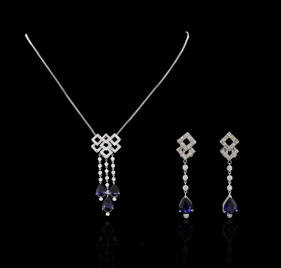 One electronically tested 18KT white gold ladies cast & assembled sapphire and diamond suite. The suite includes a pendant with chain and a pair of dangle earrings. The pendant features a geometric diamond gallery with a fringe of three sapphire drops suspended by flexible diamond ribbons. The pendant is completed by a sixteen inch length 14KT white gold designer style chain, terminating in a lobster claw clasp. The matching dangle earrings each feature a sapphire drop suspended from a flexible diamond ribbon supported by a geometric diamond set post, completed by omega backs. Bright polish finish. Identified with markings of "18K 750". Condition is new, good workmanship. Containing: Five prong set pear mixed cut natural blue sapphire, measuring 11.00. x 7.70 x 3.30mm, approximate total weight of 9.12ct., clarity is slightly included, type II, dark, moderately strong, blue color, (GIA B 7/4), cut is good. Transmitting light with a minimum of distortion, transparent. Naturally occurring internal & external characteristics are present. Indications of laboratory high temperature diffusion treatment. Graded in the setting. Nineteen bezel set round brilliant cut diamonds, measuring 2.10 - 2.10 x 1.26mm (depth est.) approximate total weight of 19 Stones = 0.68ct. The clarity grade reflects the entire range of clarity for this group. Graded in the setting. Clarity: SI-1 to I-2 . Color: G - I Thirty-Eight prong set round brilliant cut diamonds, measuring 1.40 - 1.30 x 0.81mm (depth est.) approximate total weight of 38 Stones = 0.38ct. The color grade reflects the entire range of color for this group. Graded in the setting. Clarity: I-1 to I-2 . Color: G - J Sixty-Six prong set round brilliant cut diamonds, measuring 1.40 - 1.10 x 0.75mm (depth est.) approximate total weight of 66 Stones = 0.48ct. Graded in the setting. Clarity: SI-2 to I-2 . Color: G - I. Total Weight of Colored Stones 9.12ct.. Total Weight of Diamonds 1.54ct.. Total Weight of Suite 13.62gm. AIG Appraised at $10,020.00.