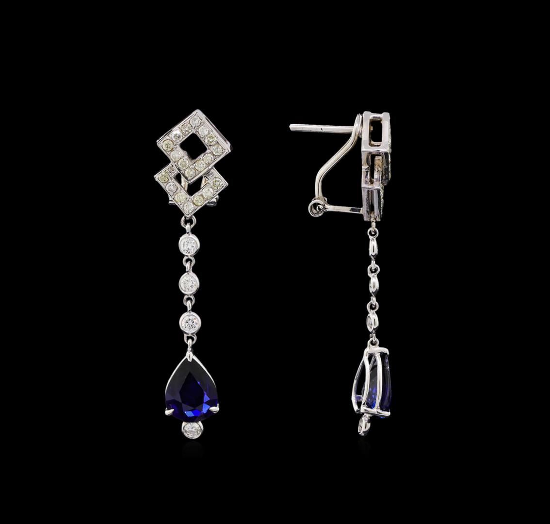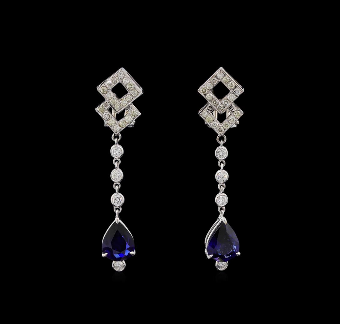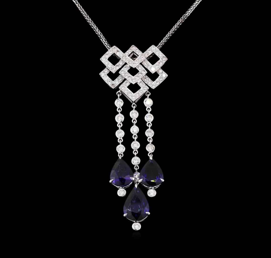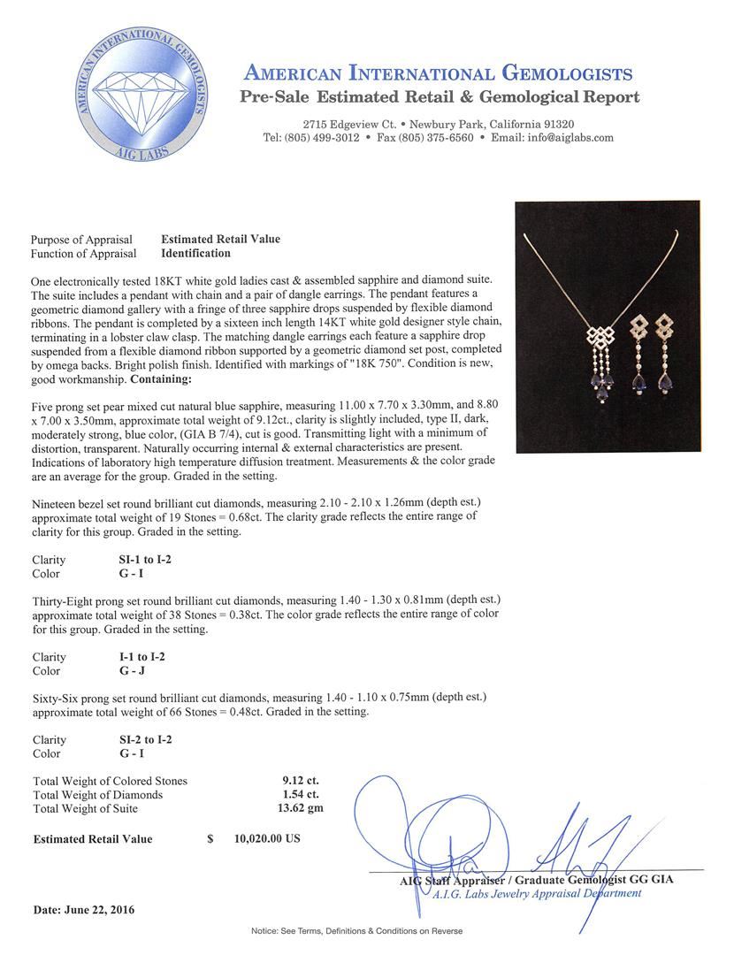One electronically tested 18KT white gold ladies cast & assembled sapphire and diamond suite. The suite includes a pendant with chain and a pair of dangle earrings. The pendant features a geometric diamond gallery with a fringe of three sapphire drops suspended by flexible diamond ribbons. The pendant is completed by a sixteen inch length 14KT white gold designer style chain, terminating in a lobster claw clasp. The matching dangle earrings each feature a sapphire drop suspended from a flexible diamond ribbon supported by a geometric diamond set post, completed by omega backs. Bright polish finish. Identified with markings of "18K 750". Condition is new, good workmanship. Containing: Five prong set pear mixed cut natural blue sapphire, measuring 11.00. x 7.70 x 3.30mm, approximate total weight of 9.12ct., clarity is slightly included, type II, dark, moderately strong, blue color, (GIA B 7/4), cut is good. Transmitting light with a minimum of distortion, transparent. Naturally occurring internal & external characteristics are present. Indications of laboratory high temperature diffusion treatment. Graded in the setting. Nineteen bezel set round brilliant cut diamonds, measuring 2.10 - 2.10 x 1.26mm (depth est.) approximate total weight of 19 Stones = 0.68ct. The clarity grade reflects the entire range of clarity for this group. Graded in the setting. Clarity: SI-1 to I-2 . Color: G - I Thirty-Eight prong set round brilliant cut diamonds, measuring 1.40 - 1.30 x 0.81mm (depth est.) approximate total weight of 38 Stones = 0.38ct. The color grade reflects the entire range of color for this group. Graded in the setting. Clarity: I-1 to I-2 . Color: G - J Sixty-Six prong set round brilliant cut diamonds, measuring 1.40 - 1.10 x 0.75mm (depth est.) approximate total weight of 66 Stones = 0.48ct. Graded in the setting. Clarity: SI-2 to I-2 . Color: G - I. Total Weight of Colored Stones 9.12ct.. Total Weight of Diamonds 1.54ct.. Total Weight of Suite 13.62gm. AIG Appraised at $10,020.00.