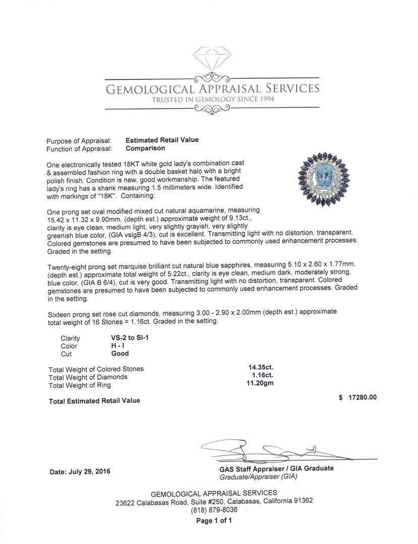 One electronically tested 18KT white gold lady's combination cast & assembled fashion ring with a double basket halo with a bright polish finish. The featured lady's ring has a shank measuring 1.5 millimeters wide. Identified with markings of '18K'. Condition is new, good workmanship. Containing: One prong set oval modified mixed cut natural aquamarine, measuring 15.42 x 11.32 x 9.90mm, (depth est.) approximate weight of 9.13ct., clarity is eye clean, medium light, very slightly grayish, very slightly greenish blue color, (GIA vslgB 4/3), cut is excellent. Transmitting light with no distortion, transparent. Colored gemstones are presumed to have been subjected to commonly used enhancement processes. Graded in the setting. Twenty-eight prong set marquise brilliant cut natural blue sapphires, measuring 5.10 x 2.60 x 1.77mm, (depth est.) approximate total weight of 5.22ct., clarity is eye clean, medium dark, moderately strong, blue color, (GIA B 6/4), cut is very good. Transmitting light with no distortion, transparent. Colored gemstones are presumed to have been subjected to commonly used enhancement processes. Graded in the setting. Sixteen prong set rose cut diamonds, measuring 3.00 - 2.90 x 2.00mm (depth est.) approximate total weight of 16 Stones = 1.16ct. Graded in the setting. Clarity VS-2 to SI-1. Color: H - I Cut Good. Total Weight of Colored Stones 14.35ct.. Total Weight of Diamonds 1.16ct.. Total Weight of Ring 11.20gm. GAS Appraised at $17,280.00.