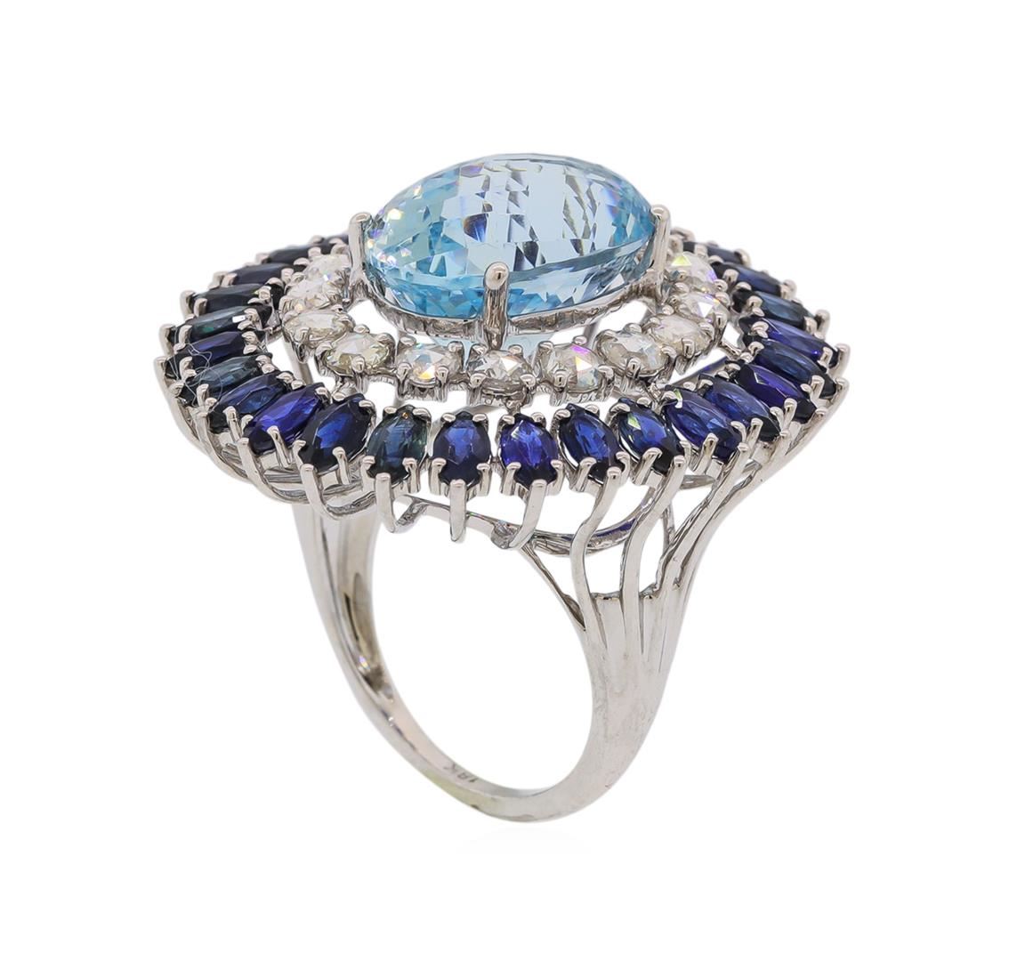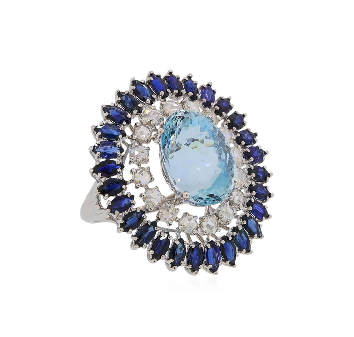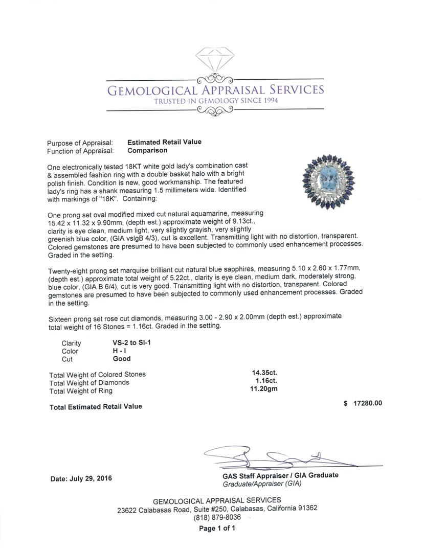One electronically tested 18KT white gold lady's combination cast & assembled fashion ring with a double basket halo with a bright polish finish. The featured lady's ring has a shank measuring 1.5 millimeters wide. Identified with markings of '18K'. Condition is new, good workmanship. Containing: One prong set oval modified mixed cut natural aquamarine, measuring 15.42 x 11.32 x 9.90mm, (depth est.) approximate weight of 9.13ct., clarity is eye clean, medium light, very slightly grayish, very slightly greenish blue color, (GIA vslgB 4/3), cut is excellent. Transmitting light with no distortion, transparent. Colored gemstones are presumed to have been subjected to commonly used enhancement processes. Graded in the setting. Twenty-eight prong set marquise brilliant cut natural blue sapphires, measuring 5.10 x 2.60 x 1.77mm, (depth est.) approximate total weight of 5.22ct., clarity is eye clean, medium dark, moderately strong, blue color, (GIA B 6/4), cut is very good. Transmitting light with no distortion, transparent. Colored gemstones are presumed to have been subjected to commonly used enhancement processes. Graded in the setting. Sixteen prong set rose cut diamonds, measuring 3.00 - 2.90 x 2.00mm (depth est.) approximate total weight of 16 Stones = 1.16ct. Graded in the setting. Clarity VS-2 to SI-1. Color: H - I Cut Good. Total Weight of Colored Stones 14.35ct.. Total Weight of Diamonds 1.16ct.. Total Weight of Ring 11.20gm. GAS Appraised at $17,280.00.