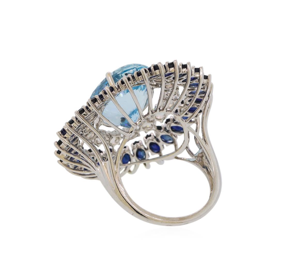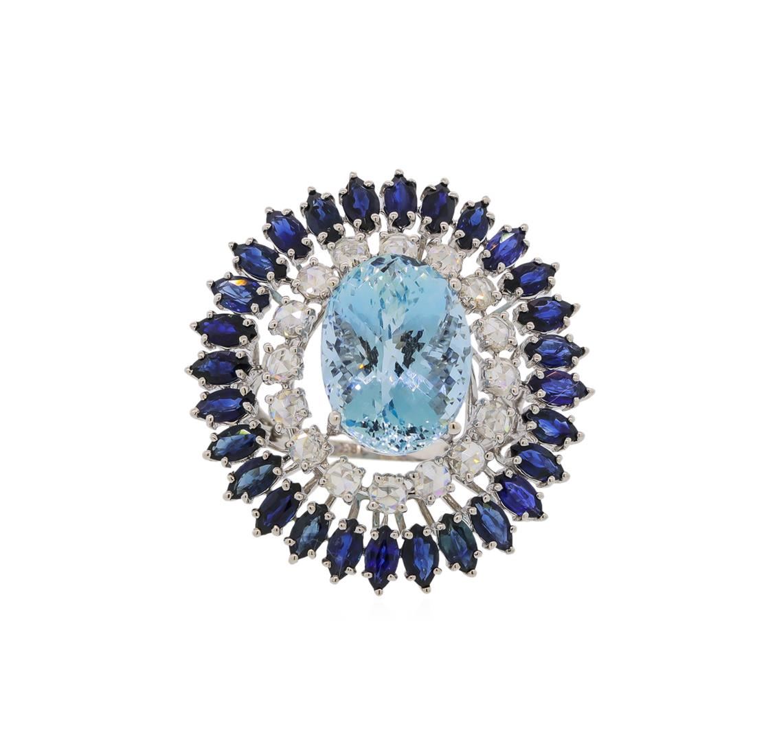 One electronically tested 18KT white gold lady's combination cast & assembled fashion ring with a double basket halo with a bright polish finish. The featured lady's ring has a shank measuring 1.5 millimeters wide. Identified with markings of '18K'. Condition is new, good workmanship. Containing: One prong set oval modified mixed cut natural aquamarine, measuring 15.42 x 11.32 x 9.90mm, (depth est.) approximate weight of 9.13ct., clarity is eye clean, medium light, very slightly grayish, very slightly greenish blue color, (GIA vslgB 4/3), cut is excellent. Transmitting light with no distortion, transparent. Colored gemstones are presumed to have been subjected to commonly used enhancement processes. Graded in the setting. Twenty-eight prong set marquise brilliant cut natural blue sapphires, measuring 5.10 x 2.60 x 1.77mm, (depth est.) approximate total weight of 5.22ct., clarity is eye clean, medium dark, moderately strong, blue color, (GIA B 6/4), cut is very good. Transmitting light with no distortion, transparent. Colored gemstones are presumed to have been subjected to commonly used enhancement processes. Graded in the setting. Sixteen prong set rose cut diamonds, measuring 3.00 - 2.90 x 2.00mm (depth est.) approximate total weight of 16 Stones = 1.16ct. Graded in the setting. Clarity VS-2 to SI-1. Color: H - I Cut Good. Total Weight of Colored Stones 14.35ct.. Total Weight of Diamonds 1.16ct.. Total Weight of Ring 11.20gm. GAS Appraised at $17,280.00.