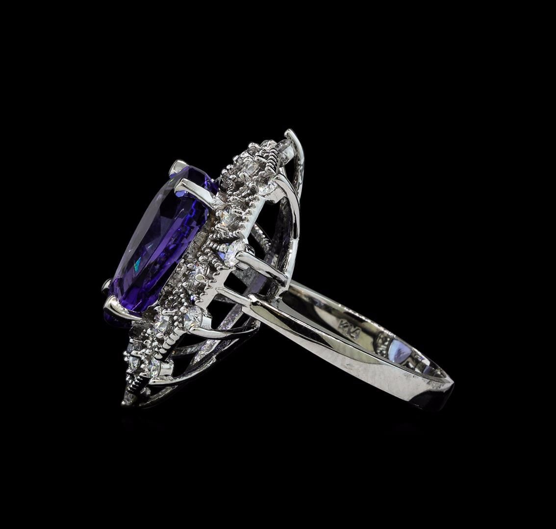 One electronically tested 14KT white gold lady's cast fashion ring with a basket double halo with a bright polish with milgrain detailing finish. The featured lady's ring has a shank measuring 2.85 millimeters wide. Identified with markings of 'K14'. Condition is new, good workmanship. Containing: One prong set pear modified brilliant cut natural tanzanite, measuring 14.63 x 11.83 x 7.19mm, (depth est.) 10%. bulge factor, approximate weight of 9.13ct., clarity is eye clean, medium light, very slightly grayish, bluish violet color, (GIA bV 4/3), cut is very good. Transmitting light with no distortion, transparent. Colored gemstones are presumed to have been subjected to commonly used enhancement processes. Graded in the setting. Twenty prong set round brilliant cut diamonds, measuring 2.40 - 2.35 x 1.45mm (depth est.) approximate total weight of 20 Stones = 1.00ct. Graded in the setting. Clarity SI-1 to I-1. Color: H - I Cut Good. Total Weight of Colored Stones 9.13ct.. Total Weight of Diamonds 1.00ct.. Total Weight of Ring 8.10gm GAS Appraised at $12,090.00.
