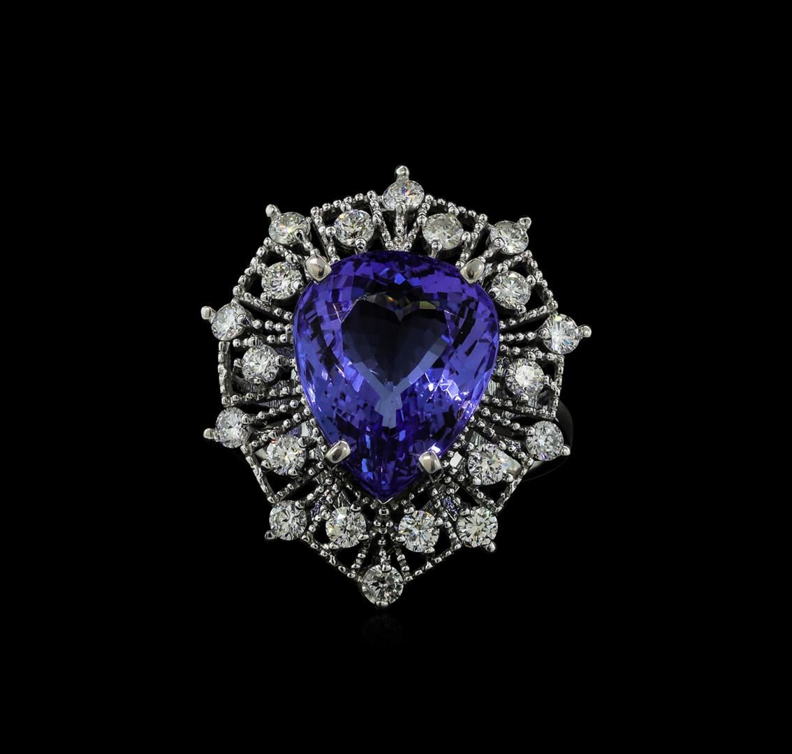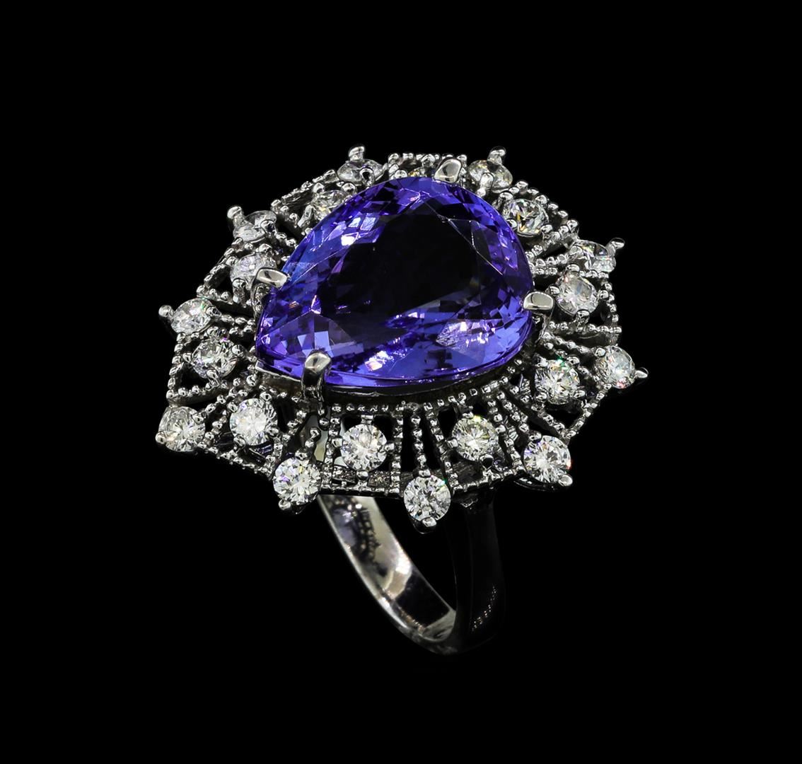 One electronically tested 14KT white gold lady's cast fashion ring with a basket double halo with a bright polish with milgrain detailing finish. The featured lady's ring has a shank measuring 2.85 millimeters wide. Identified with markings of 'K14'. Condition is new, good workmanship. Containing: One prong set pear modified brilliant cut natural tanzanite, measuring 14.63 x 11.83 x 7.19mm, (depth est.) 10%. bulge factor, approximate weight of 9.13ct., clarity is eye clean, medium light, very slightly grayish, bluish violet color, (GIA bV 4/3), cut is very good. Transmitting light with no distortion, transparent. Colored gemstones are presumed to have been subjected to commonly used enhancement processes. Graded in the setting. Twenty prong set round brilliant cut diamonds, measuring 2.40 - 2.35 x 1.45mm (depth est.) approximate total weight of 20 Stones = 1.00ct. Graded in the setting. Clarity SI-1 to I-1. Color: H - I Cut Good. Total Weight of Colored Stones 9.13ct.. Total Weight of Diamonds 1.00ct.. Total Weight of Ring 8.10gm GAS Appraised at $12,090.00.