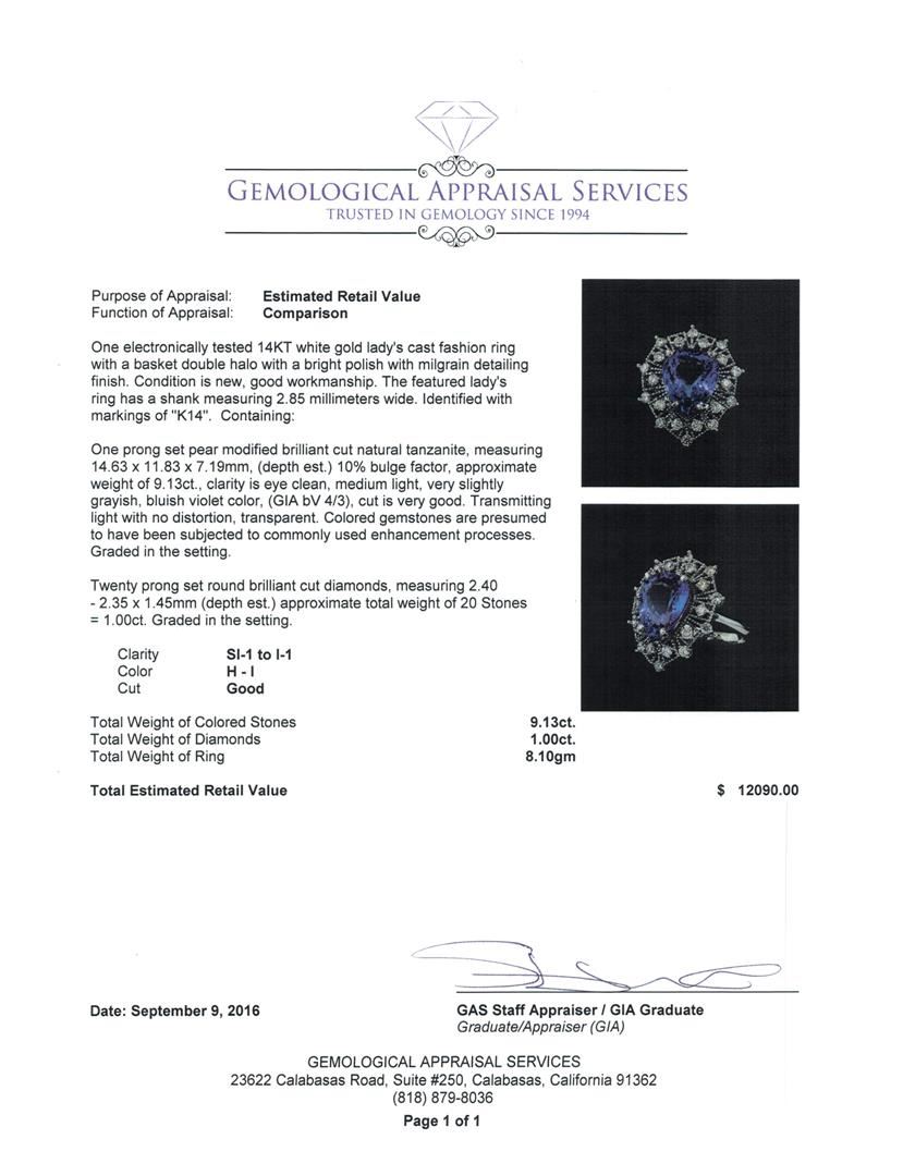 One electronically tested 14KT white gold lady's cast fashion ring with a basket double halo with a bright polish with milgrain detailing finish. The featured lady's ring has a shank measuring 2.85 millimeters wide. Identified with markings of 'K14'. Condition is new, good workmanship. Containing: One prong set pear modified brilliant cut natural tanzanite, measuring 14.63 x 11.83 x 7.19mm, (depth est.) 10%. bulge factor, approximate weight of 9.13ct., clarity is eye clean, medium light, very slightly grayish, bluish violet color, (GIA bV 4/3), cut is very good. Transmitting light with no distortion, transparent. Colored gemstones are presumed to have been subjected to commonly used enhancement processes. Graded in the setting. Twenty prong set round brilliant cut diamonds, measuring 2.40 - 2.35 x 1.45mm (depth est.) approximate total weight of 20 Stones = 1.00ct. Graded in the setting. Clarity SI-1 to I-1. Color: H - I Cut Good. Total Weight of Colored Stones 9.13ct.. Total Weight of Diamonds 1.00ct.. Total Weight of Ring 8.10gm GAS Appraised at $12,090.00.