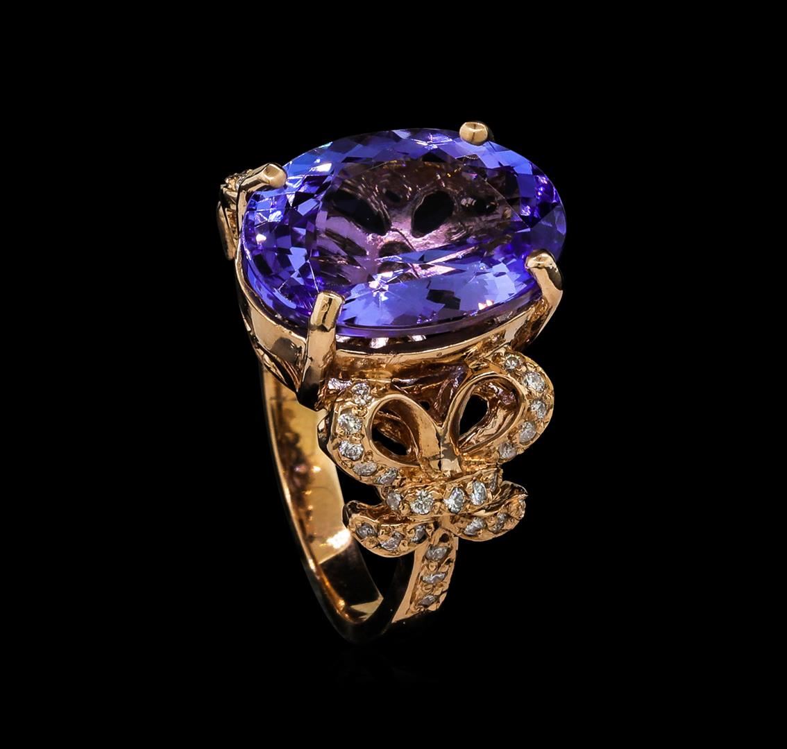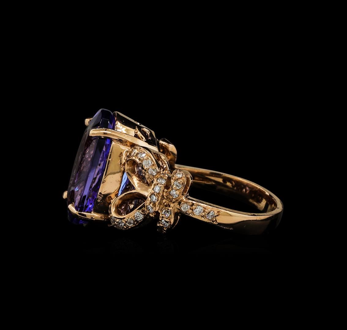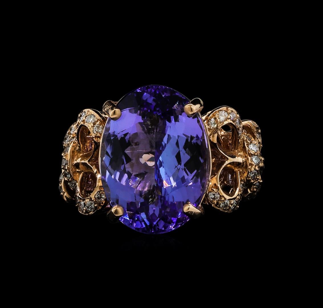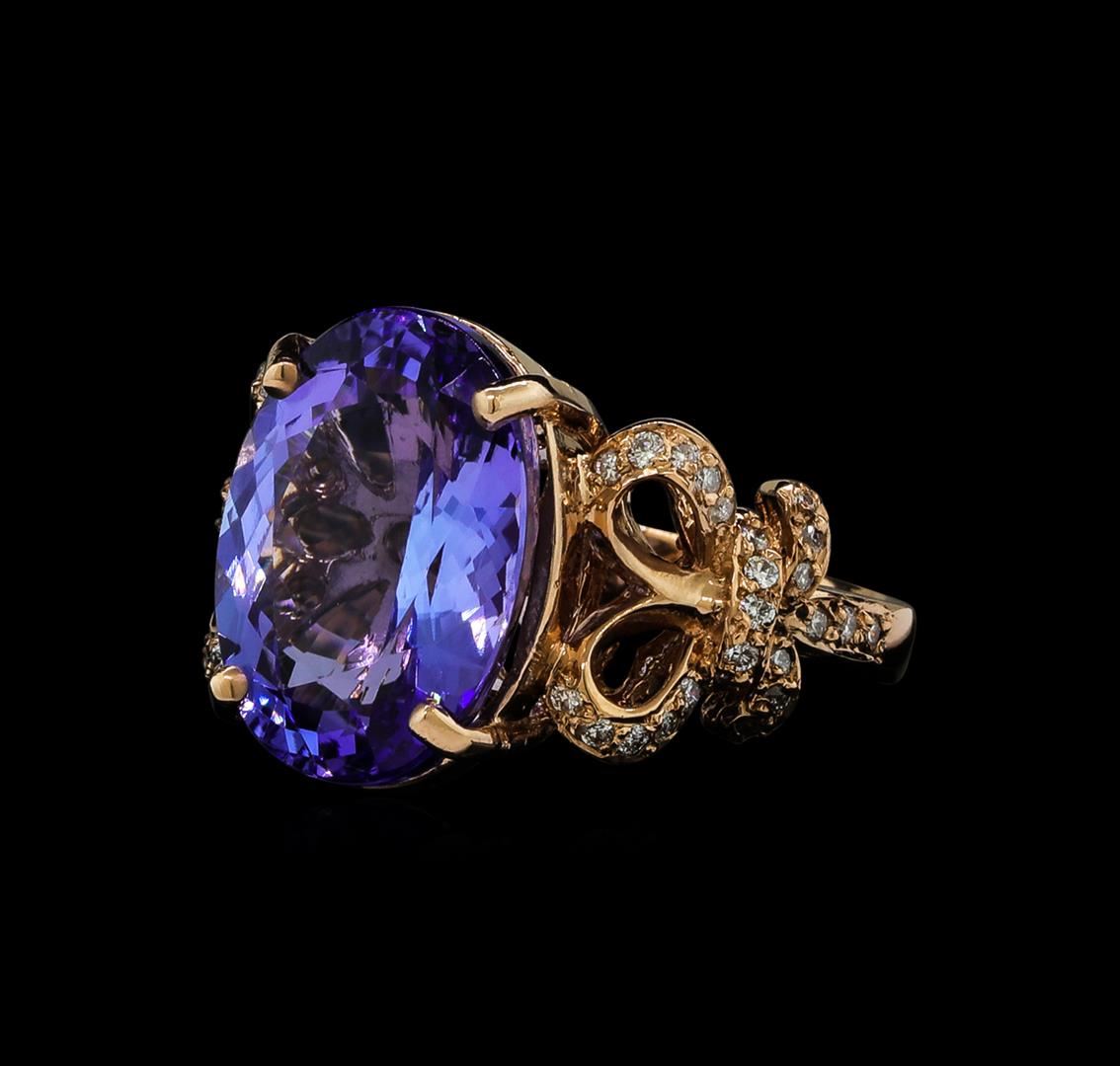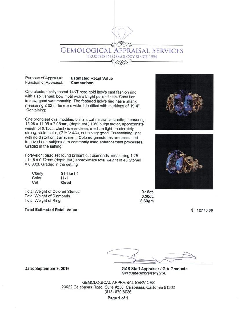 One electronically tested 14KT rose gold lady's cast fashion ring with a split shank bow motif with a bright polish finish. The featured lady's ring has a shank measuring 2.62 millimeters wide. Identified with markings of 'K14'. Condition is new, good workmanship. Containing: One prong set oval modified brilliant cut natural tanzanite, measuring 15.08 x 11.05 x 7.05mm, (depth est.) 10%. bulge factor, approximate weight of 9.15ct., clarity is eye clean, medium light, moderately strong, violet color, (GIA V 4/4), cut is very good. Transmitting light with no distortion, transparent. Colored gemstones are presumed to have been subjected to commonly used enhancement processes. Graded in the setting. Forty-Eight bead set round brilliant cut diamonds, measuring 1.25 - 1.15 x 0.72mm (depth est.) approximate total weight of 48 Stones = 0.30ct. Graded in the setting. Clarity SI-1 to I-1. Color: H - I Cut Good. Total Weight of Colored Stones 9.15ct.. Total Weight of Diamonds 0.30ct.. Total Weight of Ring 8.60gm GAS Appraised at $12,770.00.