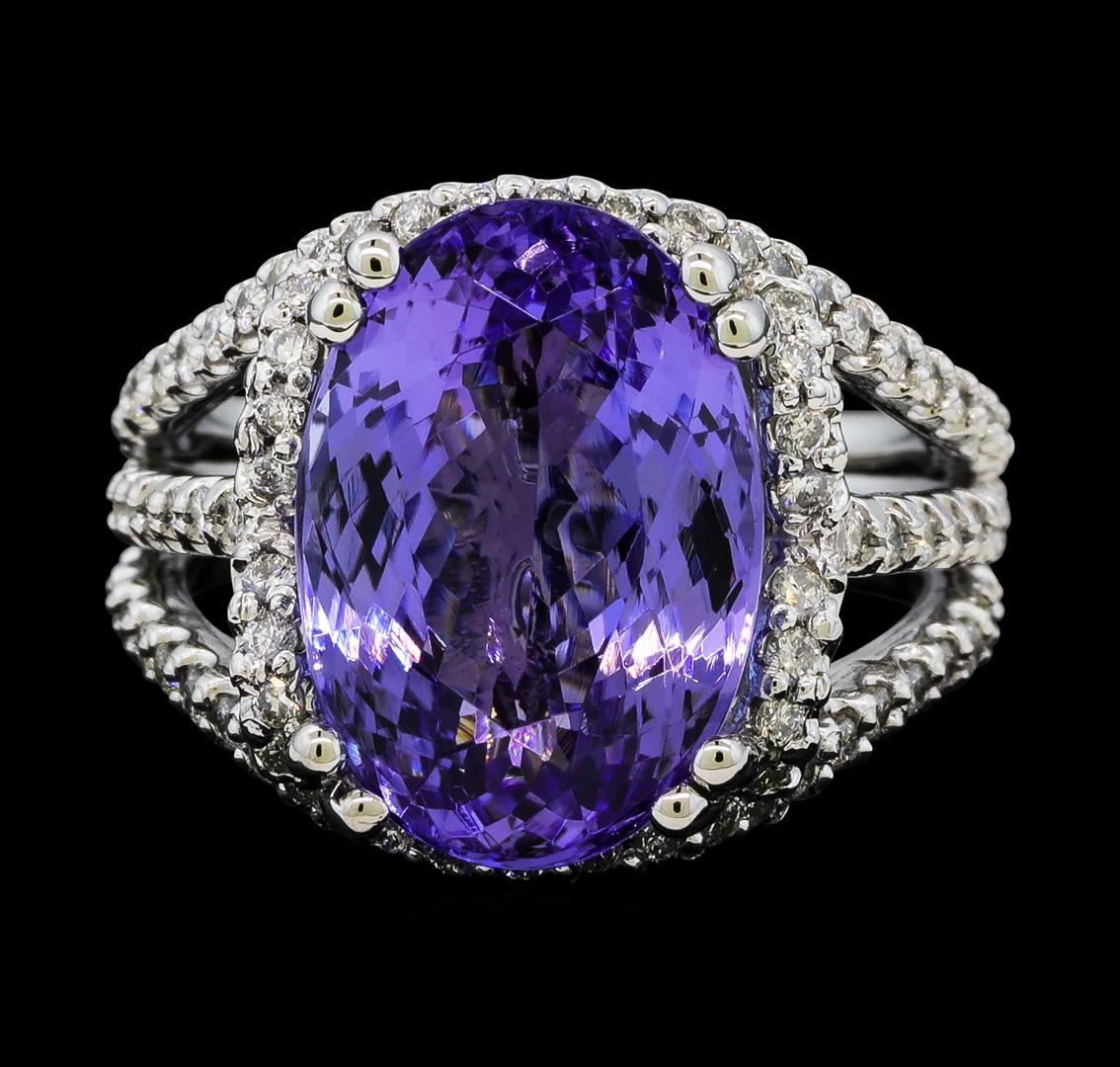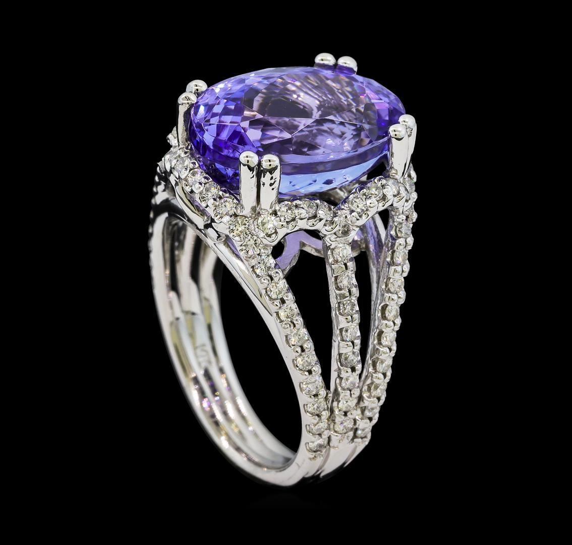 One electronically tested 14KT white gold lady's cast fashion ring with a three row cathedral shank with a bright polish finish. The featured lady's ring has a triple shank measuring 3.77 millimeters wide. Identified with markings of '14K'. Condition is new, good workmanship. Containing: One prong set oval modified brilliant cut natural tanzanite, measuring 14.60 x 10.20 x 7.50mm, (depth est.) 17%. bulge factor, approximate weight of 9.16ct., clarity is eye clean, medium, moderately strong, violet color, (GIA V 5/4), cut is very good. Transmitting light with no distortion, transparent. Colored gemstones are presumed to have been subjected to commonly used enhancement processes. Graded in the setting. Eighty-Eight prong set round brilliant cut diamonds, measuring 1.35 - 1.30 x 0.81mm (depth est.) approximate total weight of 88 Stones = 0.76ct. Graded in the setting. Clarity SI-1 to I-1. Color: G - H Cut Good. Total Weight of Colored Stones 9.16ct.. Total Weight of Diamonds 0.76ct.. Total Weight of Ring 9.40gm. GAS Appraised at $14,915.00.