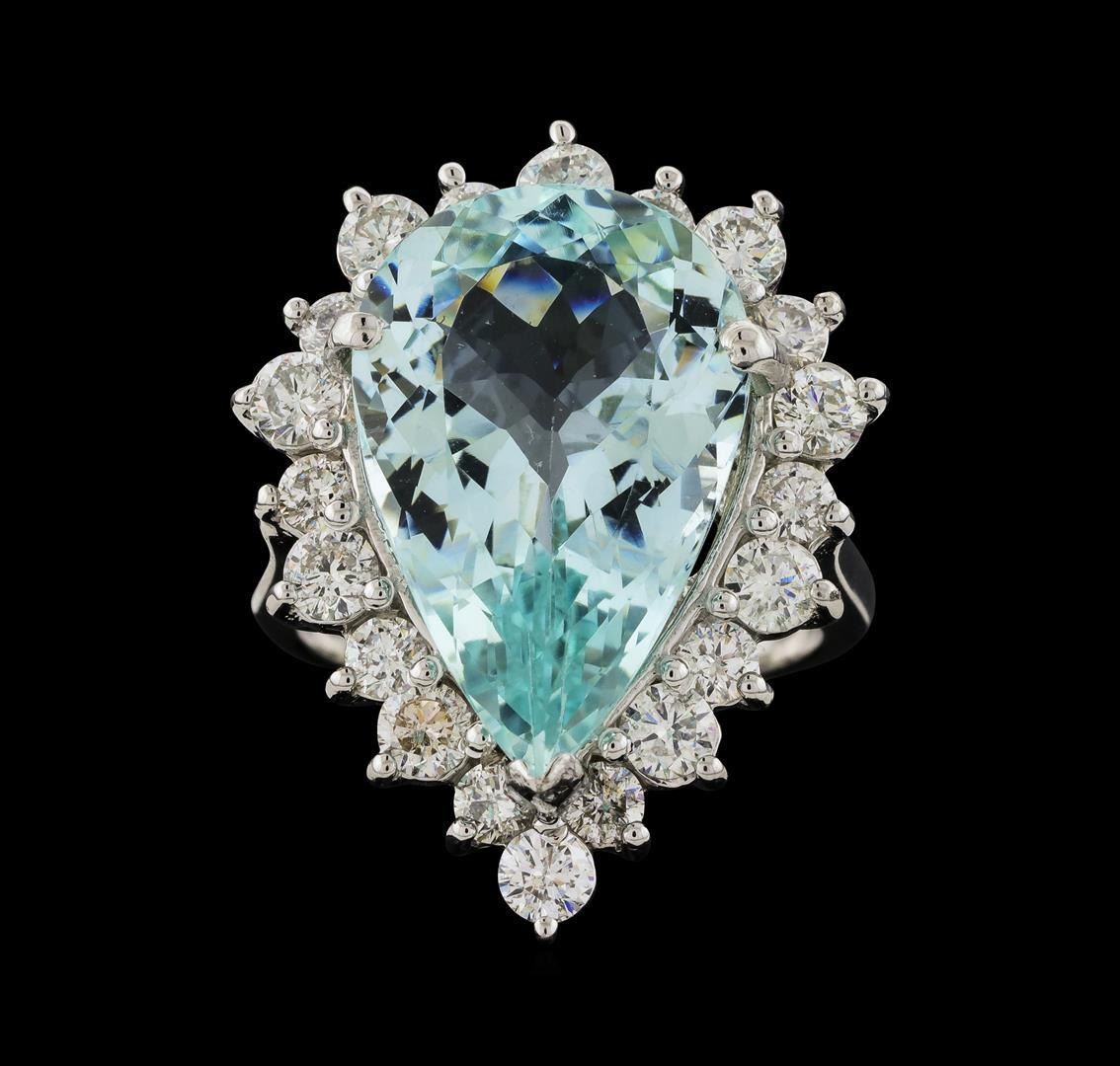 One 14KT White Gold "One of a Kind" Lady's Ring, 11.38 grams. Containing: Main Gemstones: Identity: Natural Aquamarine. Carat Weight: 9.17 cts tw. Shape & Measurement: Pear Shape. Quality: Fine color & cutting. No heat. Adjacent Gemstones: Identity: Natural Diamond. Shape: Round Brilliant Cut. Carat Weight: 1.88 cts tw. Quality: VS-SI Clarity, G-H Color. All fine cutting and proportions. Total Gemstones Weight: 11.05 cts tw. RBGS Appraised.