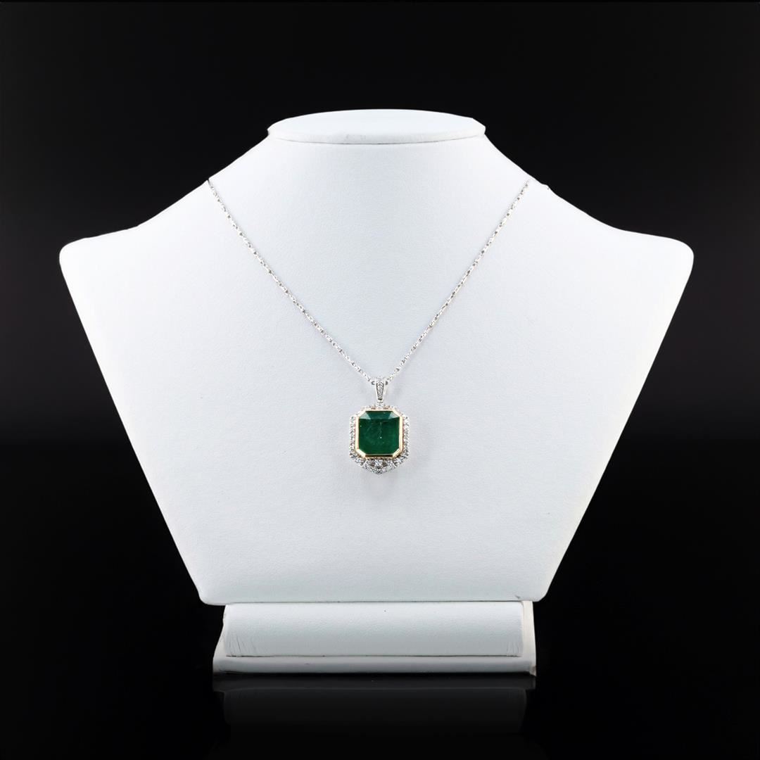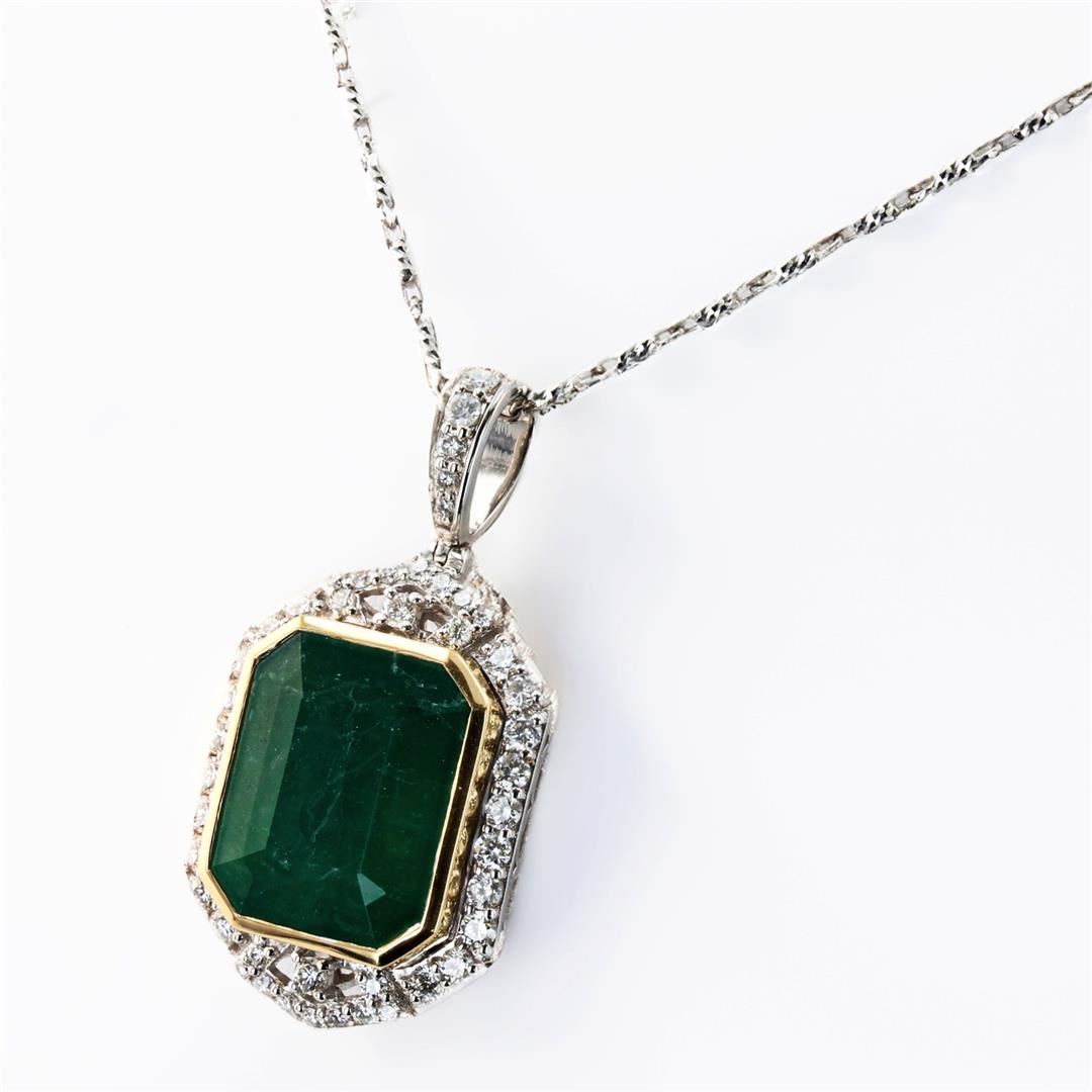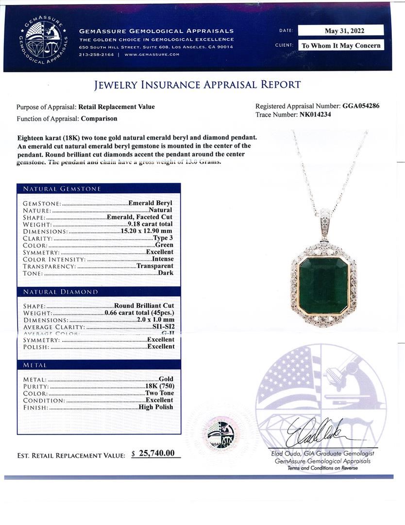 9.18ct Emerald and 0.66ctw Diamond 18K Yellow and White Gold Pendant. Eighteen karat (18K) two tone gold natural emerald beryl and diamond pendant. An emerald cut natural emerald beryl gemstone is mounted in the center of the pendant. Round brilliant cut diamonds accent the pendant around the center gemstone. The pendant and chain have a gross weight of 13.0 Grams. NATURAL GEMSTONE GEMSTONE: Emerald Beryl NATURE: Natural SHAPE: Emerald, Faceted Cut WEIGHT: 9.18 carat total DIMENSIONS: 15.20 x 12.90mm CLARITY: Type 3 COLOR: Green SYMMETRY: Excellent COLOR INTENSITY: Intense TRANSPARENCY: Transparent TONE: Dark NATURAL DIAMOND SHAPE: Round Brilliant Cut WEIGHT: 0.66 carat total (45pcs.) DIMENSIONS: 2.0 x 1.0mm AVERAGE CLARITY: SI1-SI2 AVERAGE COLOR: G-H SYMMETRY: Excellent POLISH: Excellent METAL METAL: Gold PURITY: 18K (750) COLOR: Two Tone CONDITION: Excellent FINISH: High Polish