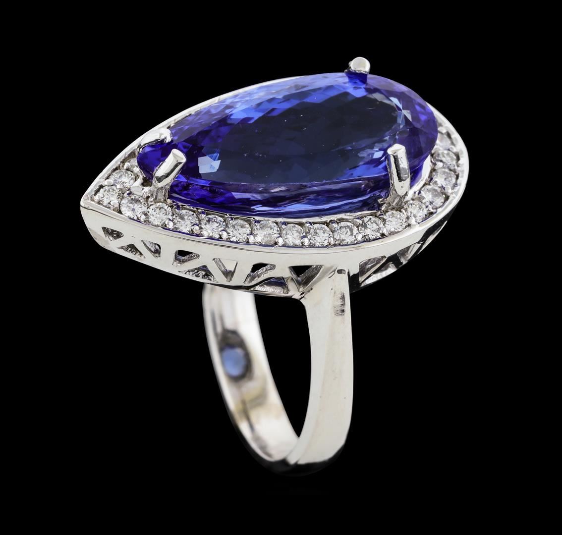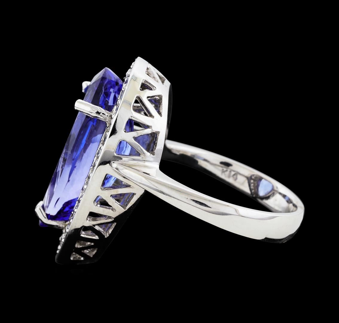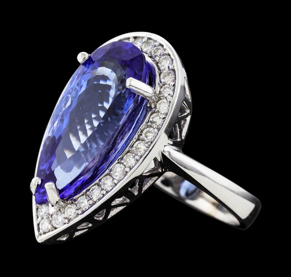 One electronically tested 14KT white gold lady's cast fashion ring with a cathedral shank with a halo with a bright polish finish. The featured lady's ring has a shank measuring 3.33 millimeters wide. Identified with markings of 'K14'. Condition is new, good workmanship. Containing: One prong set pear modified brilliant cut natural tanzanite, measuring 19.37 x 9.00 x 6.92mm, (depth est.) 14%. bulge factor, approximate weight of 9.18ct., clarity is eye clean, medium, very slightly grayish, bluish violet color, (GIA bV 5/3), cut is very good. Transmitting light with no distortion, transparent. Colored gemstones are presumed to have been subjected to commonly used enhancement processes. Graded in the setting. Thirty-Two prong set round brilliant cut diamonds, measuring 1.70 - 1.60 x 1.01mm (depth est.) approximate total weight of 32 Stones = 0.53ct. Graded in the setting. Clarity SI-1 to I-1. Color: H - I Cut Good. Total Weight of Colored Stones 9.18ct.. Total Weight of Diamonds 0.53ct.. Total Weight of Ring 9.20gm. GAS Appraised at $15,445.00.