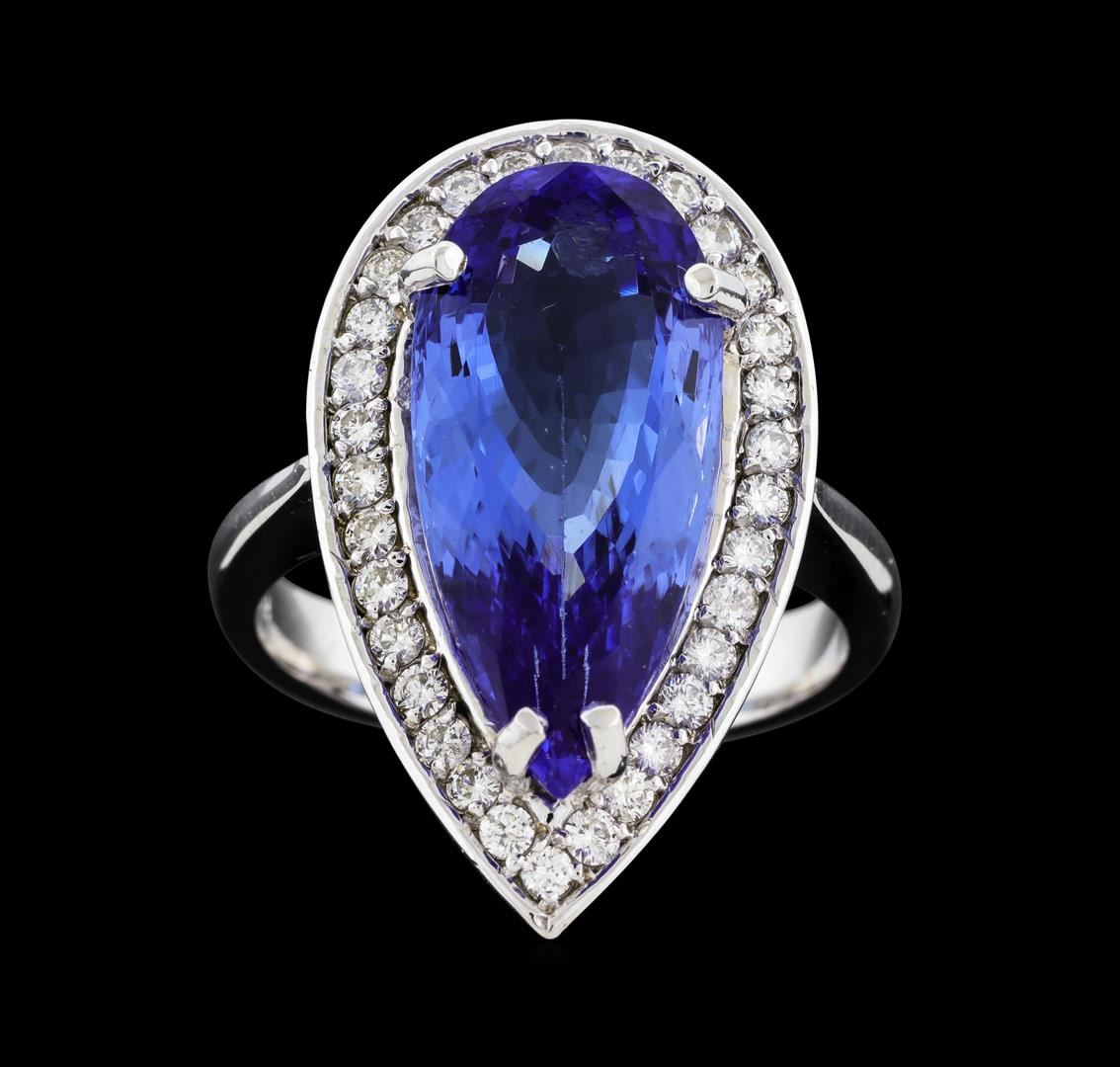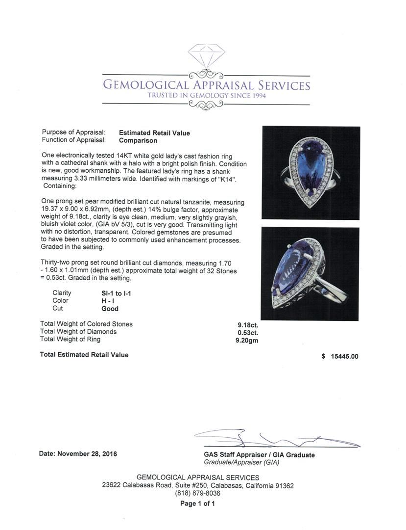 One electronically tested 14KT white gold lady's cast fashion ring with a cathedral shank with a halo with a bright polish finish. The featured lady's ring has a shank measuring 3.33 millimeters wide. Identified with markings of 'K14'. Condition is new, good workmanship. Containing: One prong set pear modified brilliant cut natural tanzanite, measuring 19.37 x 9.00 x 6.92mm, (depth est.) 14%. bulge factor, approximate weight of 9.18ct., clarity is eye clean, medium, very slightly grayish, bluish violet color, (GIA bV 5/3), cut is very good. Transmitting light with no distortion, transparent. Colored gemstones are presumed to have been subjected to commonly used enhancement processes. Graded in the setting. Thirty-Two prong set round brilliant cut diamonds, measuring 1.70 - 1.60 x 1.01mm (depth est.) approximate total weight of 32 Stones = 0.53ct. Graded in the setting. Clarity SI-1 to I-1. Color: H - I Cut Good. Total Weight of Colored Stones 9.18ct.. Total Weight of Diamonds 0.53ct.. Total Weight of Ring 9.20gm. GAS Appraised at $15,445.00.