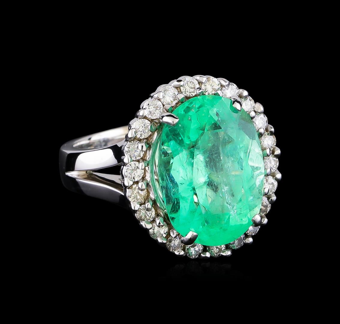 One electronically tested 14KT white gold lady's cast fashion ring with a split shank basket halo with a bright polish finish. The featured lady's ring has a shank measuring 3.70 millimeters in width. Identified with markings of "14K". Condition is new, good workmanship. Containing: One prong set oval modified brilliant cut natural emerald, measuring 15.62 x 11.75 x 8.30mm, (depth est.) 5%. bulge factor, approximate weight of 9.20ct., clarity is moderately included, medium light, moderately strong, green color, (GIA G 4/4), cut is good. Transmitting light with a minimum of distortion, transparent. Colored gemstones are presumed to have been subjected to commonly used enhancement processes. Indications of oil residue. Graded in the setting. Twenty-Two prong set round brilliant cut diamonds, measuring 2.10 - 2.00 x 1.23mm (depth est.) approximate total weight of 22 Stones = 0.70ct. Graded in the setting. Clarity: SI-1 to SI-2. Color: H - I. Cut Good. Total Weight of Colored Stones 9.20ct. Total Weight of Diamonds 0.70ct. Total Weight of Ring 11.20gm GAS Appraised at $23,300.00.