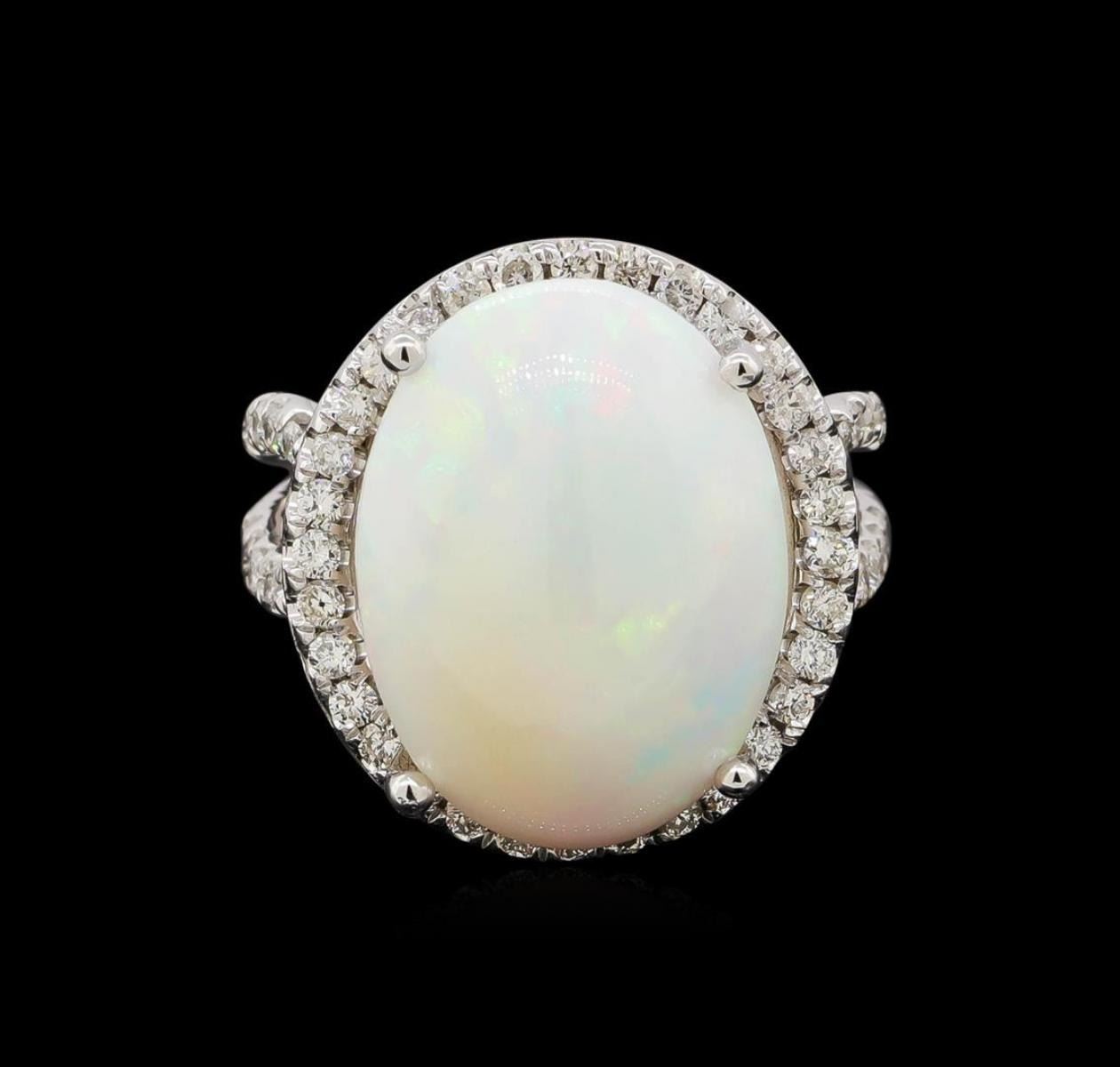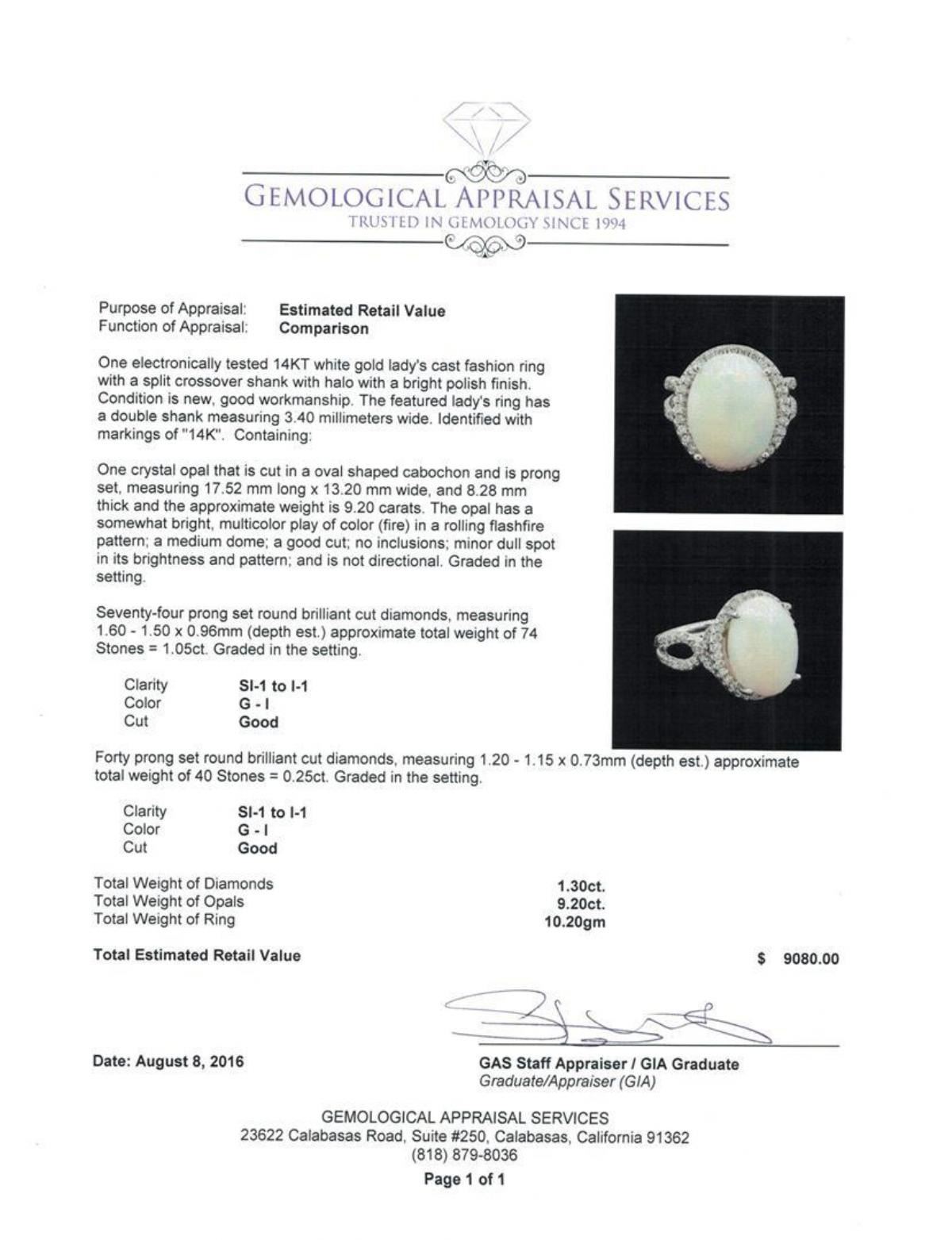 One electronically tested 14KT white gold lady's cast fashion ring with a split crossover shank with halo with a bright polish finish. The featured lady's ring has a double shank measuring 3.40 millimeters wide. Identified with markings of '14K'. Condition is new, good workmanship. Containing: One crystal opal that is cut in a oval shaped cabochon and is prong set, measuring 17.52 mm long x 13.20 mm wide, and 8.28 mm thick and the approximate weight is 9.20 carats. The opal has a somewhat bright, multicolor play of color (fire) in a rolling flashfire pattern; a medium dome; a good cut; no inclusions; minor dull spot in its brightness and pattern; and is not directional. Graded in the setting. Seventy-Four prong set round brilliant cut diamonds, measuring 1.60 - 1.50 x 0.96mm (depth est.) approximate total weight of 74 Stones = 1.05ct. Graded in the setting. Clarity SI-1 to I-1. Color: G - I Cut Good Forty prong set round brilliant cut diamonds, measuring 1.20 - 1.15 x 0.73mm (depth est.) approximate total weight of 40 Stones = 0.25ct. Graded in the setting. Clarity SI-1 to I-1. Color: G - I Cut Good. Total Weight of Diamonds 1.30ct.. Total Weight of Opals 9.20ct.. Total Weight of Ring 10.20gm. GAS Appraised.