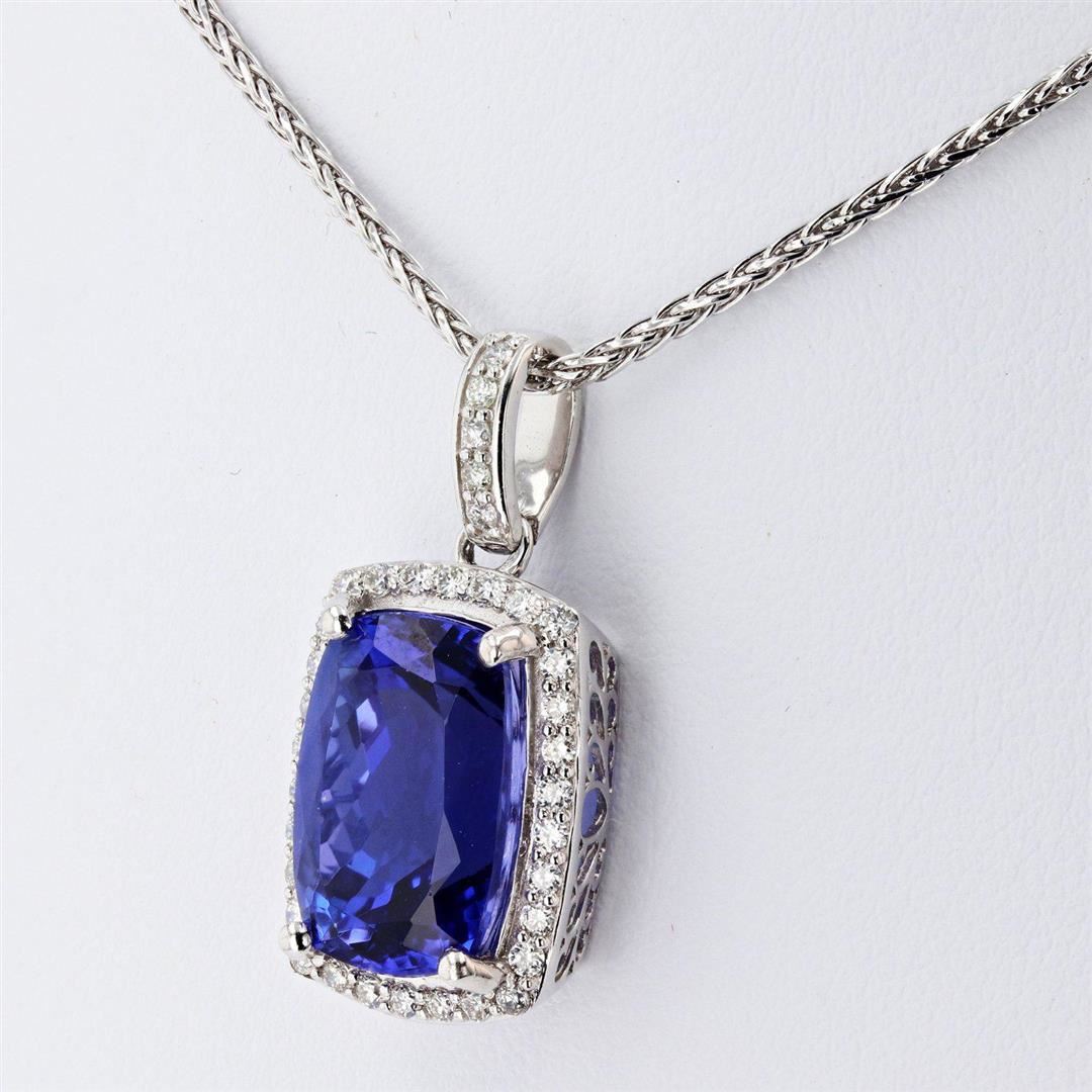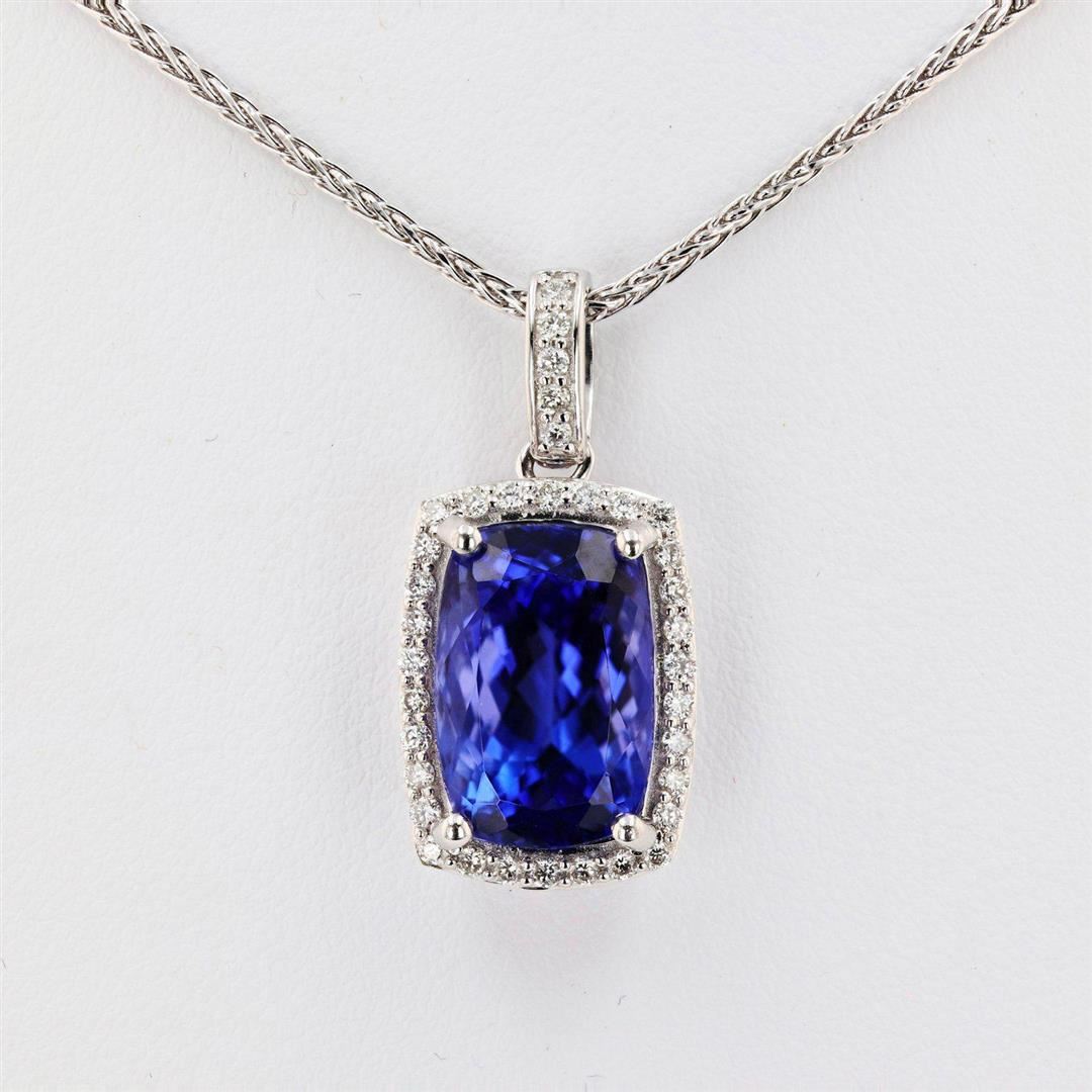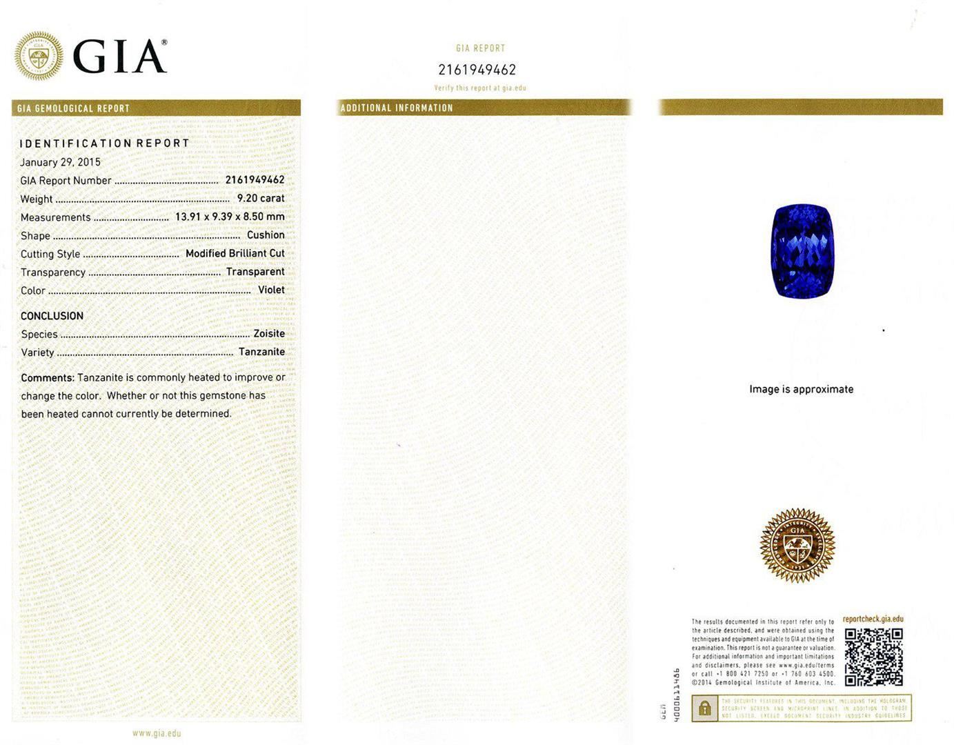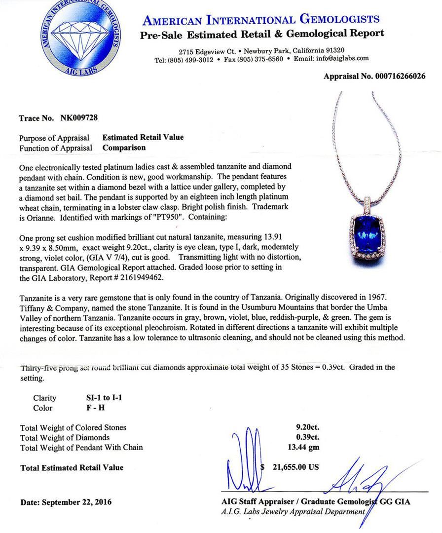 One electronically tested platinum ladies cast & assembled tanzanite and diamond pendant with chain. Condition is new, good workmanship. The pendant features a tanzanite set within a diamond bezel with a lattice under gallery, completed by a diamond set bail. The pendant is supported by an eighteen inch length platinum wheat chain, terminating in a lobster claw clasp. Bright polish finish. Trademark is Orianne. Identified with markings of "PT950". Containing: One prong set cushion modified brilliant cut natural tanzanite, measuring 13.91 x 9.39 x 8.50mm, exact weight 9.20ct., clarity is eye clean, type I, dark, moderately strong, violet color, (GIA V 7/4), cut is good. Transmitting light with no distortion, transparent. GIA Gemological Report attached. Graded loose prior to setting in the GIA Laboratory, Report # 2161949462. Tanzanite is a very rare gemstone that is only found in the country of Tanzania. Originally discovered in 1967. Tiffany & Company, named the stone Tanzanite. It is found in the Usumburu Mountains that border the Umba Valley of northern Tanzania. Tanzanite occurs in gray, brown, violet, blue, reddish-purple, & green. The gem is interesting because of its exceptional pleochroism. Rotated in different directions a tanzanite will exhibit multiple changes of color. Tanzanite has a low tolerance to ultrasonic cleaning, and should not be cleaned using this method. Thirty-five prong sct round brilliant cut diamonds approximate total weight of 35 Stones = 0.39ctw. Graded in the setting. Clarity SI1 to I1 Color F - H Total Weight of Colored Stones 9.20ct. Total Weight of Diamonds 0.39ctw. Total Weight of Pendant With Chain 13.44 gm