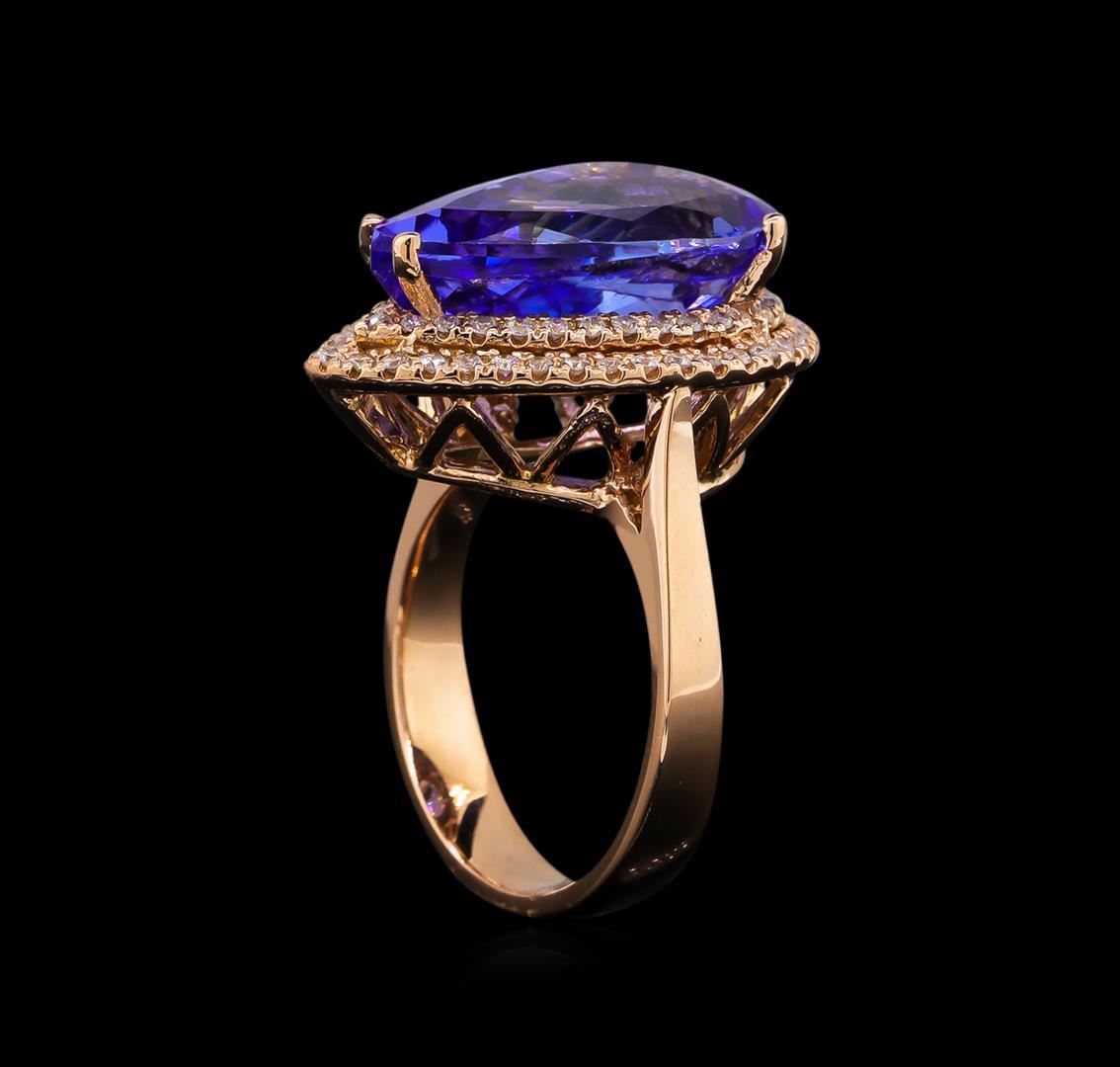 One electronically tested 14KT rose gold lady's cast fashion ring with a double basket halo with a bright polish finish. The featured lady's ring has a shank measuring 3.75 millimeters wide. Identified with markings of "K14". Condition is new, good workmanship. Containing: One prong set pear modified brilliant cut natural tanzanite, measuring 17.72 x 11.04 x 7.17mm, approximate weight of 9.20ct., clarity is eye clean, type I, medium, moderately strong, violetish blue color, (GIA vB 5/4), cut is very good. Transmitting light with no distortion, transparent. Colored gemstones are presumed to have been subjected to commonly used enhancement processes. Graded in the setting. Seventy prong set round brilliant cut diamonds, measuring 1.30 - 1.15 x 0.75mm (depth est.) approximate total weight of 70 Stones = 0.48ct. Graded in the setting. Clarity: SI-1 to I-1. Color: H - I. Cut Good. Total Weight of Colored Stones 9.20ct. Total Weight of Diamonds 0.48ct. Total Weight of Ring 9.30gm. GAS Appraised at $17,365.00.